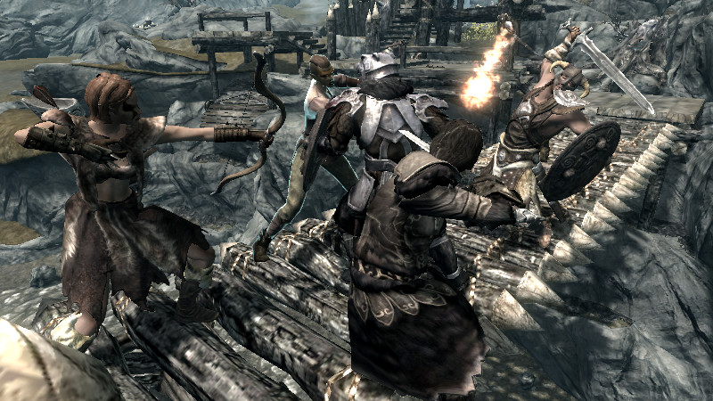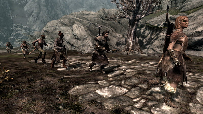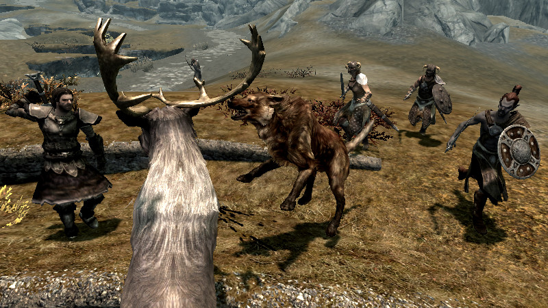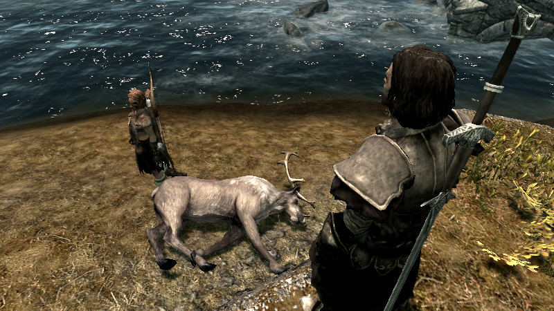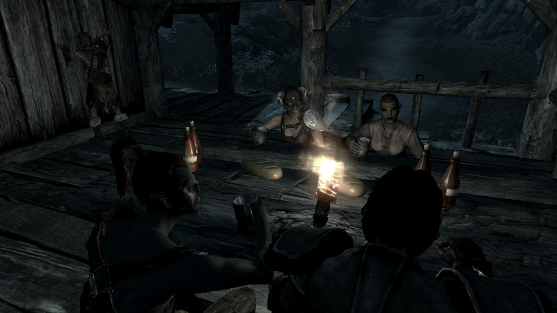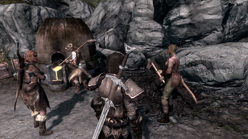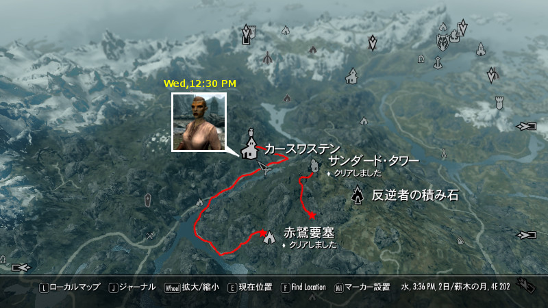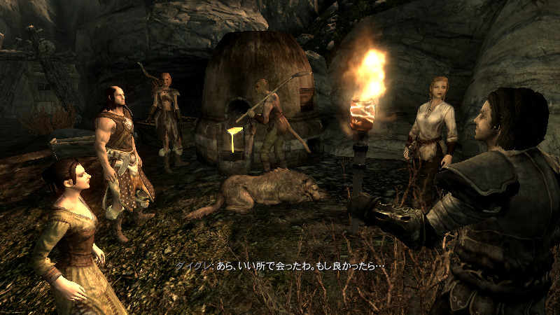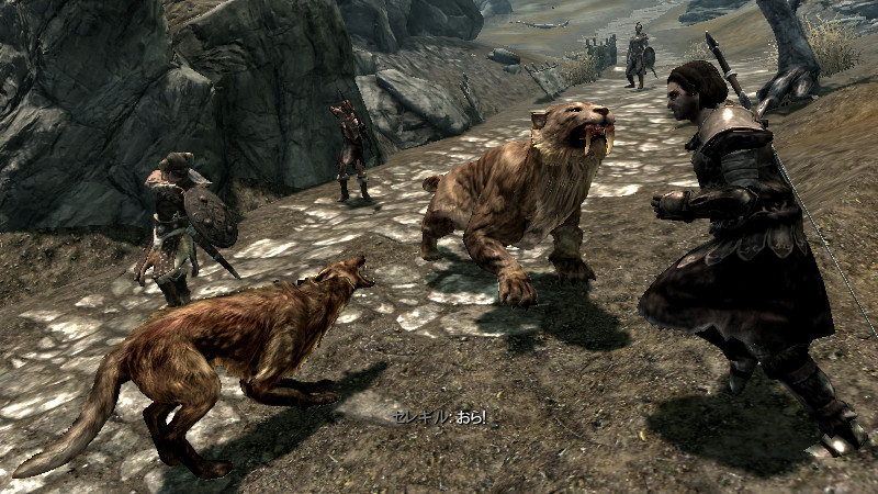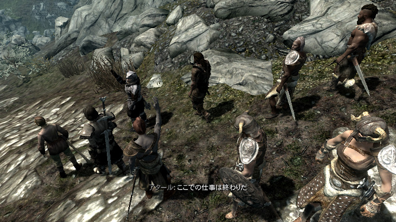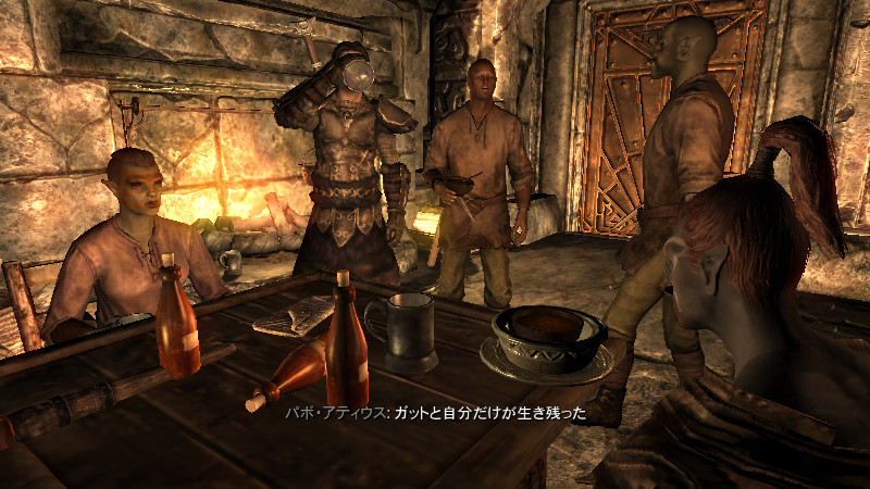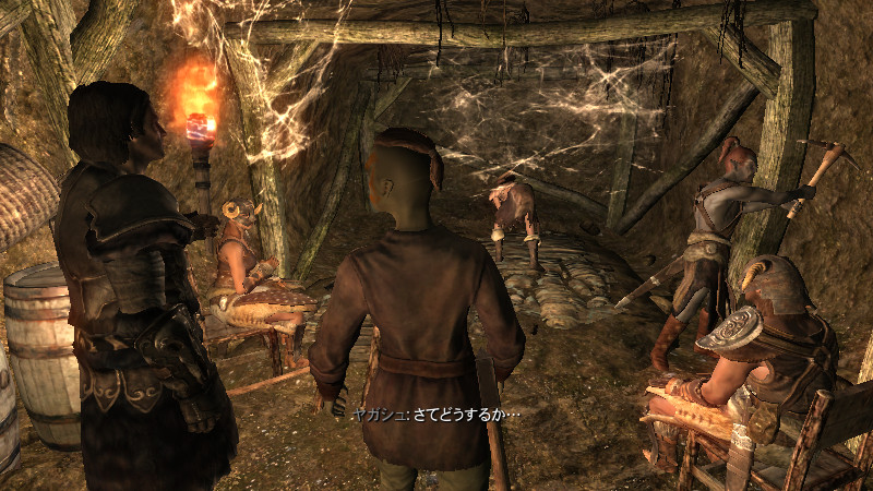 2015/03/24 Category : お気に入り AIの革命⑦~『SLFollowers』体験記録~ シルバーブラッドとの問題を解決すると…カースワステンの人々は、より採掘量が多い「サヌアラッチ鉱山」で働きはじめますが…ヤガシュさんは黙々と一人、「フィンの渓谷鉱山」で採掘作業を行っていました。 労働者同士、採掘してよい場所などの取り決めがあるみたいです。もしくは、渡りの労働者ならではの“鑑識眼”によって鉱石の出る場所を熟知していて、「まだまだ、この鉱山は生きている…」と、カースワステンの労働者たちが見落としている鉱脈を掘っているのかもしれません。 ここまでの旅を振り返ってみます。 火曜日の早朝に『セレディル』さんを仲間にし、赤鷲要塞でフォースウォーン達から“赤鷲の剣”を回収。夜通し走り続け…無事に敵を巻いて、サンダードタワーの反対側の麓にある「カースワステン」に到着したのが水曜日の早朝。そのまま祝賀パーティーをし…アイネサック氏に依頼された鉱山の問題を解決しに向かう途中で、『ヤガシュ』さんに会ったのが、水曜の午後のことでした。赤鷲要塞をクリアすると、“反逆者の積み石”というロケーションが出現しました。 ヴィルカス達も採掘作業に加わります。掘る場所をフォロワー達に占領され、困惑するヤガシュさん。 時々、鉱山内部と入口の溶鉱炉を行き来しながら…熱心に仕事に取り組みます。 午後22:00。日が暮れるまで働くと、アイネサック氏のバルコニーへ移動して食事を摂りはじめました。実は…シルバーブラッドとの激闘の末、追い払うことに成功したのに…ヴィルカス達は“休憩場所”を確保できませんでした。500ゴールドの報酬のみ(正直、ベッドの方が良かった)。「鉱山労働者の兵舎」には鍵がかけられていて、開放されていません。そういえば…エンモンさんの娘「フョトラ」をまだ救出していないので、彼らと本当の信頼関係が築けていなかったのかも…。 翌日金曜日、午前8:00にヤガシュさんは、カースワステンを出発。村を去るアタール達とも道中一緒でした。彼らはマルカルスの「宿屋シルバーブラッド」へ帰って行くようです。思い返せば、雇われの傭兵達だったので…鉱山を支配するといった執着心は、そこまで強く無かったのかもしれません。 この地域は、とても天候が変わりやすい。雪はあまり降らないようですが、雨がとにかく多いロケーションです。水源に富んでおり、いくつもの橋が掛かっています。思わず飛び込んで、スローターフィッシュやサケなどの魚獲りをしたくなります。同胞団にも、こういう時にアルゴニアンのフォロワーが居たらいいのですが…。 懐かしい風景が見えてきました!リーチの主要都市、「マルカルス」。現在は、ファルカスとマダナックの弟子が「魔法の耐性実験」を行うために潜入しているようですが…彼らはどうしているのでしょうか?しばらく、音沙汰がありません…(汗) ヤガシュさんの次の目的地は、「レフトハンド鉱山」でした! 正午12:00に到着して早々、溶鉱炉で銀のインゴットを作っていました。 ヤガシュ「産出された鉱石の不純物を取り除き、こうやって成型しておくんだ。その方が利用価値が高くなるし、持ち運ぶのにも良い。」 午後16:30、鉱山に入り採掘作業。この後、ヴィルカス達も一緒に掘り続け、銀鉱石と原石をたくさん入手できました。集めた銀はどうしよう?マダナックの弟子にあげたら研究材料に喜びそうだし、エオルンドに新しい武器や装飾品を作ってもらったり、ゴールドに換金しても良さそうです。 午後19:00、再び溶鉱炉での作業。この村は作業場に人が集まるので、とても賑やかです。馬鹿犬だのガミガミ女だの…結構、際どい発言が飛び交っていました(笑) 日も暮れて、そろそろ仕事は終わり。午後20:00にヤガシュさんは「鉱山労働者の兵舎」へ。カースワステンの兵舎には入れなかったので、開いていて本当に良かった!! 中には、「コルスケッガー鉱山」から命からがら逃げだしてきた、パボさんとガットさんが居ました。彼らの会話からは、またもやフォースウォーンの影がチラつく…。暖炉のスープ鍋は空になっていました…。 明日の朝、ヤガシュさんを正式に雇用して、次の目的地を目指します!! 土曜日午前8:00。パンとエールのみの侘しい食生活にウンザリしていた一行は、今度は『セレディル』さんのフォロワー状態を解除して、“狩り場”に案内してもらいます! ヴィ「これで、やっと肉をたらふく喰えるぞ!」 一同「案内してくれ!!」 セレディルさんがどこかに向かって走り出しました!!ヴィルカス達も後を追います。足が……速すぎる!!全速力で、彼女を見失わないようにしなければなりません。 二時間弱走り続け…遂に彼女が歩みを止めました。その先に待っていたのは……セレディルさんの“相棒”『ウルフ』でした!!火曜日にロリクステッドでセレディルさんに会った際には、別行動をとっていたようです。現在は土曜日であり、雇用を一時解