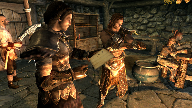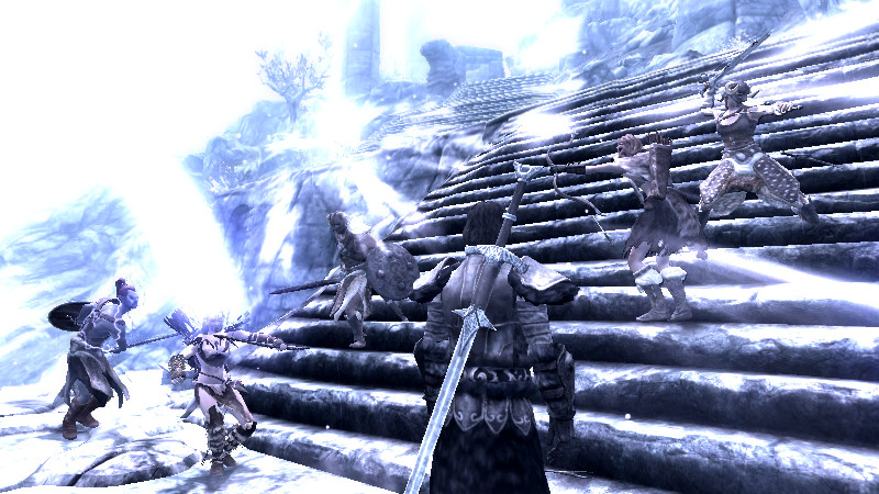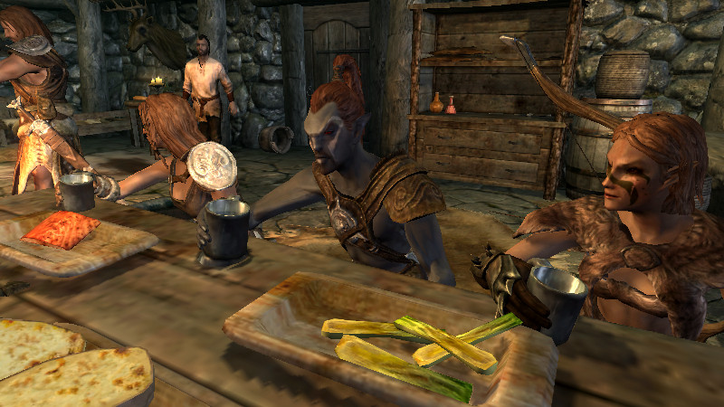 2015/02/14 Category : お気に入り AIの革命④~『SLFollowers』体験記録~ ここは…“ゾルグンデの巣窟”にある鉱山労働者の小屋―――。 ロリクステッドで、ドヴァキン女さんとセレディルさんを旅に誘ったヴィルカス一行は、旅の目的を共有するとともに、これからの戦いに向けて体力を蓄えていた……。 アシスはまた、両手に花のポジションに居座っていました……。 これまでの旅路を振り返ってみます。(※途中でアップデートしたので…最新版ではSLFの進路に変化があるかもしれません) 月曜の早朝にジョルバスクルに居た“ドヴァキン男”さんを誘い、旅を開始。夕方はロリクステッドの宿屋で“ドヴァキン女”さんが飲んでいて、翌日火曜日の農場の坂のあたりに“セレディル”さんが現れました! ヴィ「デサイプル(マダナックの弟子)曰く、“赤鷲が死に際に託した剣”はリーチで力を持つ者の手に渡り…現在ではフォースウォーンの誰かが所持しているようだ…。彼は“赤鷲が誕生した地・サンダード”に行けば何か手がかりが掴めるかもしれないと言っていた。」 ドヴァ男「フォースウォーン?……では、彼らを相手にしろと…?無法者たちだという噂を聞くが…。」 ヴィ「俺も昔はそう考えていた。一部の者は、そのようだ…。だが、リーチの情報を集めていると…彼らなりの理由も、少なからずあるような気がしている。現在、“統率者”は姿をくらましており、一団の長が各々の考え方で自由に活動しているらしい。丘の上に住み、自らを“フォースウォーン”と呼ぶこの連中は情け容赦ない。」 アシ「この地にも“オオカミの群れ”がいたとはな…!」 セレ「彼らの“縄張り”には近づかないようにしていたのに…。」 ヴィ「今のは少し耳が痛いな。しかし、今回の目的は彼らとの闘争ではない。“赤鷲に関する情報を手に入れる事”、ただそれだけだ。」 『赤鷲の剣を見つける』という矢印は、最初『赤鷲要塞』の位置を示していました。しかし、要塞の中に入ると…矢印の位置が変わり、さらに奥にある『サンダード・タワー』を指し示すようになります。ヴィルカス一行が目指すこの地は…実はフォースウォーン関連のロケーションの中でも屈指の堅牢なダンジョンとなっているようです。 四方を山脈(赤い部分)に取り囲まれているため、最奥部のサンダードに辿りつく唯一の道は、『赤鷲要塞』を通ること。それぞれ数十名のフォースウォーン達が待ち構えている、『カーススパイヤーの野営地』→『赤鷲要塞(入口)』『赤鷲の上り坂(ダンジョン)』→『サンダード・タワー』と…果てしない道を越えた先に、伝説の剣が待っているのでした……。 無駄な血を流すことを回避する策を考えた末、ヴィルカスは――― カーススパイアーに差し掛かる前の山間の丘陵を、歩けるギリギリのラインで『透明化薬』を飲んで突破! 道の選択を少しでも誤ると…谷に潜むハグレイヴンに気付かれるorフォロワーが敵に反応して大乱闘になってしまいます。 ゆっくりと隠密で抜け、『赤鷲要塞』に到着。さらに…裏道を発見!“鹿の串刺し”が目印です。ジャンプでココをよじ登ります。『赤鷲の上り坂』のダンジョンを回避して一気に『サンダード・タワー』がある要塞内へ侵入!! この方法では、“ジャンプできない”フォロワー達が着いて来られないため…要塞の内側から一瞬だけ、ダンジョンのゴール地点に入ることで、フォロワーがしばらくするとダンジョンを通過して傍に来てくれます。“待ち合わせ方式”を駆使して、誰にもに気付かれること無く、サンダードの麓まで辿りつきました。 ―――数時間前…セレディルさんは、狩人の眼で『サンダード・タワー(別名:赤鷲塔)』を偵察していました。 (回想) アシ「この場所は…フォースウォーンの”楽園”か“聖域”のようだな…。」 セレ「獲物の匂いがするわ…それも“大物”のね……ヴィルカスの勘は案外、当たっているかもしれない……んっ?…誰か出てきた!!」 「!!?」 セレ「アシス…あれを見て!!ほら、あの…“胸に大きな穴が空いている奴”よ!」 アシ「まさか…!!」 ヴィ「皆、準備はいいか?これから“ある作戦”について指示する!『赤鷲作戦』とでも銘打っておこう!」 「フォースウォーン達は、無法者とはいえ…デサイプルにとっては大事な“同胞”だ。彼らとはなるべく争わず、穏便に事を済ませたい。それには―――」 一同「…ふむふむ。なるほど……」 ―――そして、いよいよ『赤鷲作戦』決行の時! ヴィ「ドヴァキン班…任せたぞ!」 ドヴァ二人「武運を。」 (スゥゥゥッ……ドゴォォーーン!!!) ヴィ「スゥームが“作戦開始の合図”だ!!!走れーーー!」 (ゴロロロロ……ズンッ…!!) アシ「う゛わぁぁ゛…目の前に雷がァ~…またかーッ!」 怯えるアシスを横目に…ドヴァキン班が、異変に気付いたフォースウォーン達を引き付けます。武装解除や氷晶のシャウトによってどんどん敵を無力化!その隙に、ヴィルカス班は階段を駆け上がり、上層部にある祭