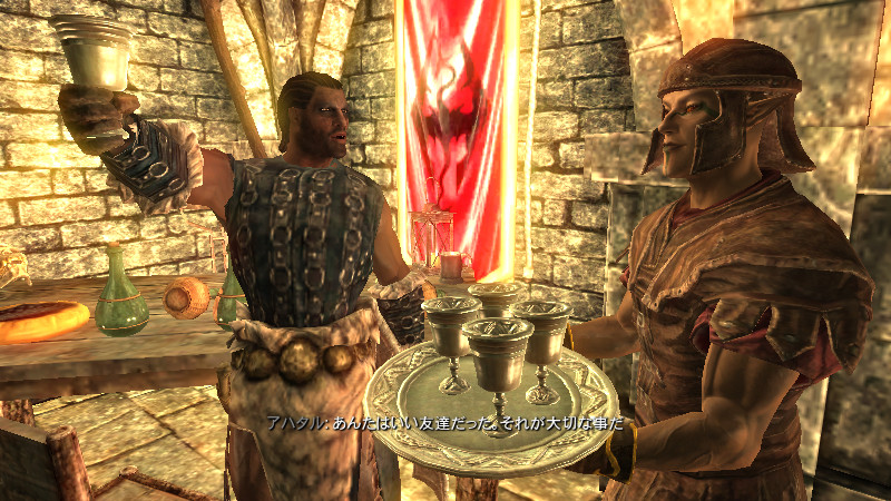 ロッグヴィル処刑後の慰労会(実際にはそんなイベントはありませんが…)。監獄にも看守達が過ごせる、こんな豪勢な部屋まで用意されているとは。(大都市ソリチュードはスカイリムの庶民にとって、きっと夢の街なのだろうなぁ…)
