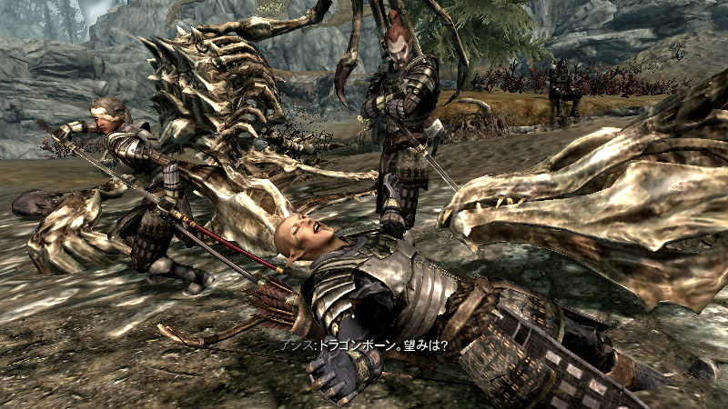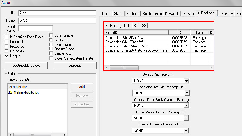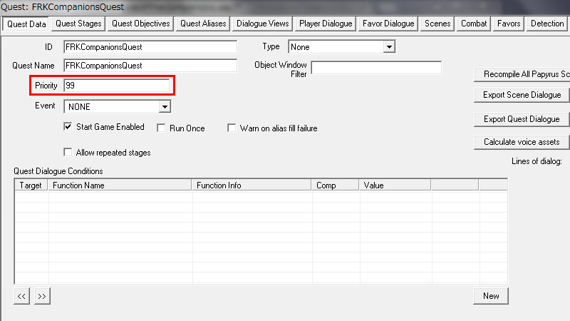 2015/08/12 Category : プレイ日記 自作Modのテストプレイ⑥ 自作Modを作り始めてから、あと少しで完成という所まで来ていたので、前回の『ブレイズ入団編』の最中に、自作Questによって「※Quest同士の優先度によるAIの上書き」が発生する事態に直面し、正直困惑してしまいました。おそらくブレイズQuestに限らず、他のQuestにも影響を及ぼしかねない、中々手強い問題であると考えられます。 ※ブレイズに入団させたNPCが、スカイ・ヘヴン聖堂で暮らさずに、自作したAIで勝手に行動してしまう問題。 なんとなく、前々から危ない予感はあったのですが…筆者自身、Quest製作の知識が圧倒的に不足しているので、「どうか何も起こらず上手く行きますように!」という思いで、テストプレイで実際にどうなるのかを試して、観察していました。そして、案の定…不具合が生じてしまいました。この状況になってみるまでは、どういう所が良くなかったのかが全く分かりませんでした。自分はフォロワー(広義にはNPC)に、「AIを設定する際の基本ルール」というものを理解していなかったことに気が付きました。 今回はその反省を踏まえて…頭の中の情報を整理する意味も込めつつ、「AIを設定する際の注意点」と「Quest同士の優先度の調整方法」について、苦戦した部分をまとめておきたいと思います。 【戦士と武士】 ~前編~ デルフィンに「アシス達を連れ戻しに行け!」との命令を受けた道化エルフは、急いでジョルバスクルへと戻るも…一足先に彼らは「冒険Package」によって、既に消息を絶っていた。そして数日間、“配達人”のごとくスカイリム全域に渡って、野を越え…山を越え…スタミナの続く限り、駆けずり回る羽目になったのであった。 ―――遂に街道でアシス達を発見した道化エルフ。彼らは付近の円墳から出現した個体と自然発生した個体の、“2匹のドラゴン”を相手に、攻防を繰り広げていた。(旅先でも偶然、※ブレイズの使命を全うしていた姿には…驚きました!!) ※フォロワーをブレイズに入団させると、「BladesFaction」の他に、「BladesRecruitsFaction」が付与されるようです。この派閥は、“DragonFaction”と「Enemy」の関係にあるため、ドラゴン出現時に、入団以前よりも素早く反応して戦闘態勢に移行できるようになっていました。CKで確認するまで全く気づきませんでしたが…ブレイズの一員になったことで、いくつかの“見えない変化”がフォロワーに与えられているようです。 道化エルフ「あれッ…?!(いたーーー!!!)」 道化エルフ「…ハァ……探したぞ、アシス…スカイリム中を“ランダムに放浪”しやがって!本当に…お前たち(NPC)の身勝手さには、恐怖を感じざるを得ないヨ…。」 アシス「こんな所まで後を追って来たのか、なんてしつこい奴だ。見ての通り、我々は“ブレイズの役割”をきちんと果たしているぞ!…それで、何か用か?」 (とりあえず、アシス達が聖堂に戻ってくるように『説得』しなければ……) 道化エルフ「ブレイズには、栄誉と栄光!充実した活動や強力な装備!!敵に見つからない広大な隠れ家!!!全てが揃ってイル。現在は小規模だが…発展次第でひょっとすると、スカイリム史上…“最強の組織”になり得るんジャないか?…古参者の方が敬われるし、いっそのこと同胞団から早いうちに“鞍替え”を……いや、今のは言葉の綾ダ! それらを放棄してまで、“同胞団になる”というのは、どういう意味を持つんだ?(実際にはイイとこ取りをシテるだけなんだけど、汗)」 アシス「個人的には、馬鹿げた質問に2度答えなくて済むって事だと思っている。我々の存在意義も知らずに、なぜジョルバスクルにわざわざやってきたんだ?」 (シャキキキン…) 道化エルフ「アハッ…?!!」 『説得』、失敗―――。 アシス「―――これはお遊びなんかじゃない。我々はスカイリムにおける真の精神性の象徴だ。栄誉は血に、死は心に宿る。」 ハドリア「まさかあなたには…」 スレンドラ「その覚悟が無いと…?」 道化エルフ「いやいやいや×3……私の“スキンヘッド”にかけて、こんな馬鹿げたことを言うつもりは、毛頭なかった!(連れ戻しに来ただけなのに…なんか、到着早々…完全に誤解されちゃってるんですケド。油汗)……普段よりカッコ良い台詞を吐きすぎてて、全く伝わって来ないんだヨ。つまり、それは―――?」 アシス「―――富と栄光のためだ、友よ。ただそれだけだ。」 道化エルフ「ズコ~ッ…!!!(なるほどネ、さすがは同胞団の初期メンバー。実に脳筋で単純明快だ…。常に心にアルのは、同胞団。だけど、ブレイズも『掛け持ち』シテ、双方から“甘い汁を吸う”って魂胆か。そして、富と栄光の先には…念願の“サークル”の座が待っている訳ダ、納得。……って、結局いつものパターンかいッ!!)」 「じゃ、じゃあ…アシスはともかく、同胞団の新人2名!! 普段から無口で、黙ってることが多いけど…お前らは何なんだヨ? 新参者に、そこまで同胞団への思い入れがアルのか?」 スレンドラ「ブ