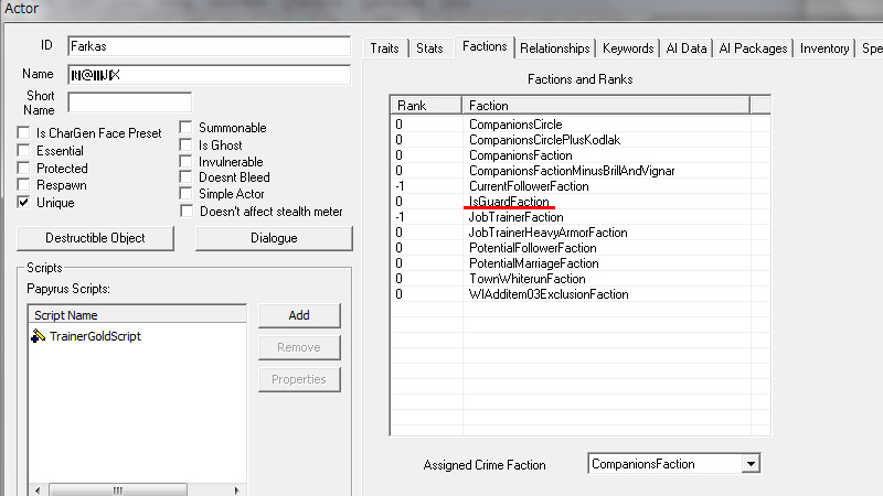 CrimeFactionだけは他のFactionと扱いが違い、Actorが生成された時点からずっと抜けられない仕様になっているようです。また「IsGuardFaction」は、取得した時点で「IsGuard=1.00」となり、「衛兵」の属性が付きますが、このFactionから抜けても衛兵属性だけは残ってしまうようです。何故このようなことが起こるのか……今のところ原因は不明です。