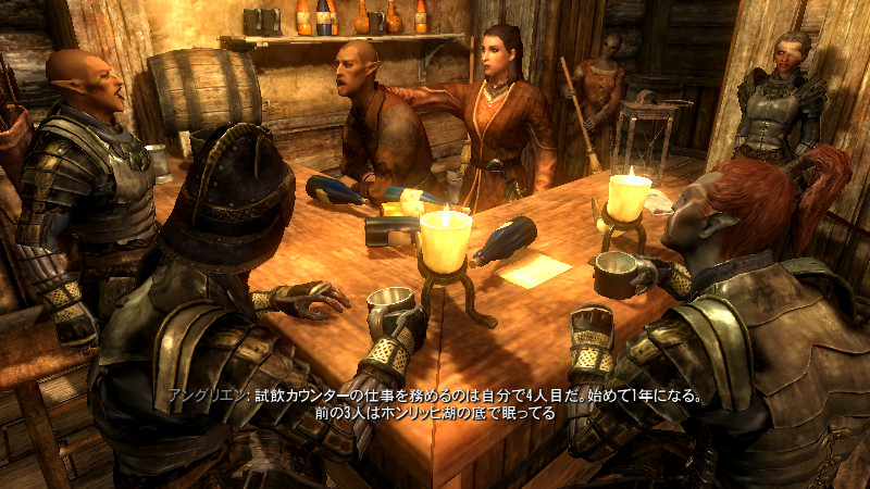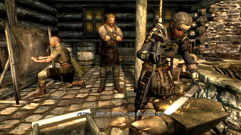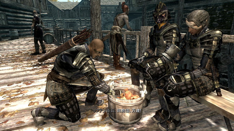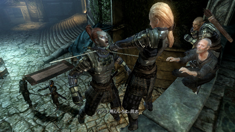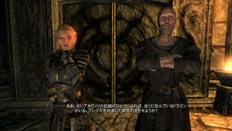 2015/08/23 Category : プレイ日記 自作Modのテストプレイ⑦ アシス達がブレイズに入団したことをきっかけに、自作AIの優先度に従って勝手に行動していた彼らを適切に誘導できるよう、「同胞団」と「ブレイズ」という2つの派閥を『掛け持ち』するための方法を考えることになりました。解決策に行き詰っていたところ、「Questを分割する」という素晴らしいアドバイスをいただけたおかげで、フォロワーAIの複雑な構成が可能になりました! 大きな成果として、Quest同士の相互関係を利用した製作に、理解が深められたように思います。 登場回数の乏しいNPCに「ブレイズ」などの肩書を与えることで、彼らにイキイキとした人生を歩んでもらうことができます。その一方で、プレイヤーの“相棒”として、複数の役割を担当させ、どんな時も行動を共にしたい、特別な存在のフォロワーもいると思います。そのような場合に、『Quest連動型AI』を作成することによって、フォロワーのAIに条件の変化に応じた判断を行わせ、様々な立場を交替で活動してもらうのも、これまでとは違った新鮮さがあると感じられました。 “あらゆる組織に加入することができる、”プレイヤーほどの特権を持つことはできませんが、スカイリムの“複数のギルドをまたにかけて行動するフォロワー”が現れたら、強力な助っ人になりそうです。それとは逆に、立場を伏せて敵組織に潜入していて、ある日突然裏切りを働く“スパイNPC”なども居たら、緊張感のあるロールプレイを楽しめそうな気もします。 テストプレイの確認ポイントのうち、『ブレイズ』の項目を無事にクリアすることができました。次は、もう一つの待望(?)のテーマである―――フォロワーの『結婚』について、調査を開始します。 戦いを積み重ねる内に、貫禄と渋味が出てきたアシスの「※“花嫁”になるのは、果たして誰なのか?」。様々な派閥に属しているフォロワーの「結婚後の生活がどう変わるのか?」。そして、「自作Modとの関係性」について、お楽しみプレイと共に入念にチェックをしていきます。 ※花嫁役として、プレイヤーが一時的に“あるNPC”の役を演じながらアシス(フォロワー)と結婚する予定です! 『結婚』は、離婚や再婚ができないスカイリムでは…“人生たった一度限りの重大イベント”! またもや、テストプレイの方が疎かになってしまいますが、この機会を盛大に楽しんでみたいと思います。 【マーラが微笑みますように!】 vol.1~恋の予感~ 冒険Packageの旅日程が終了し、数日後にスカイ・ヘヴン聖堂に帰ってきたアシスは早速、デルフィンからの“愛の鞭”という名の“お仕置き”により、強烈なトラウマを植え付けられることになった。 (……ヒュォォォオ~……) ハドリア&スレン「隊長……。(明日は我が身だ…)」 (メキメキメキッ×2……ジタバタ×2……) アシス「グェーッ!!!…がはぁっ…が…か…(落ぢるッ…斬られ゛るッ……息がでぎないッ…お助けを゛……)」 その光景を目の当たりにした、新人2名。彼らがブレイズの任務中に、勝手な理由で行動することは……金輪際ないと思われる―――。 反省と自戒の念を込めて、同胞団一行はデルフィンからの、「※ドラゴン狩り」へ行って来い、という指令を快く引き受けました。 道化エルフ「・・・。(ドラゴンを倒すことが義務化し、いつの間にか…彼らの中だけでどんどん話が進んでいるッ!それに…異様なまでの、“してやってる感”。…ドラゴンボーンは戦いにおいて、常に一対一でケリを着けなきゃいけナイ伝統でもあったのか??自分たちは決して現地へは赴かず、新人をこき使ってイルというのに。…元祖ブレイズ、いや…彼らはもしや、精神がブレないという意味の…“ブレ~ず”なのかもしれン!!)」 ※ブレイズの「ドラゴン狩り」のQuest、「FreeformSkyHavenTempleB」(Priority=46)が開始されると、非雇用状態のフォロワー達は、一斉に現地に向かって走り出しました。現在、同胞団の活動を「月・火・木・金」、ブレイズの活動を「水・土・日」に設定していますが、いずれのAIにも影響されることなく、プレイヤーがエズバーンから依頼を受け取った瞬間に、どちらの場所に居たとしても現地に集合してくれました。(自作Modによる悪影響が出なくて良かったです!) エズバーンに「ドラゴンスレイヤーの祝福」を授けてもらい、“ボーンストレウン山脈”へ向かいました。たった4人だけで、巨大なドラゴンに立ち向かって行く宿命を背負っているなんて…ブレイズって、本当に恐ろしい秘密組織です(ブラックすぎる)。それゆえ、ドラゴンボーンのレベルに着いて行ける精鋭や、ずば抜けた戦闘能力を持った選ばれし者のみが生き残り…入団を許可されたり、日常に厳しい制約と戒律が設けられていたりする側面があるのかもしれません…。 しかし、割とあっさりドラゴンを仕留めてしまう同胞団。アシスを始め…彼の「Class」から派生したステータスを持つ同胞団の新人2名は、『片手武器適性』と『重装適