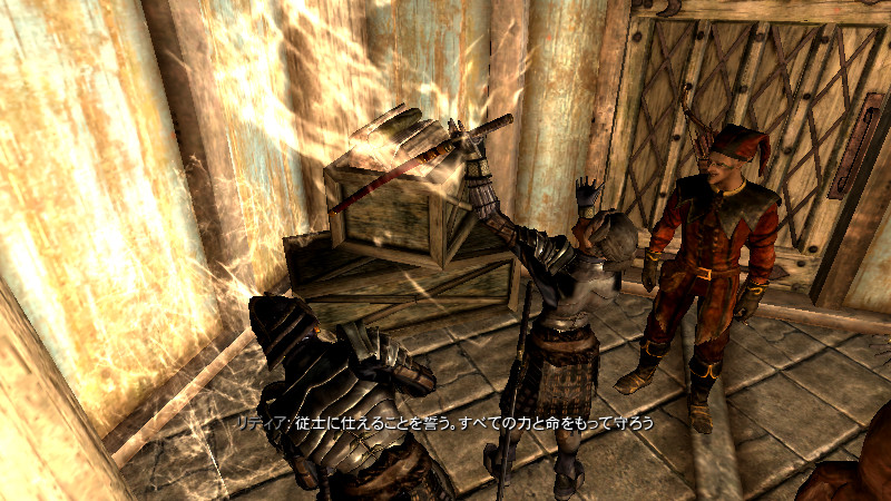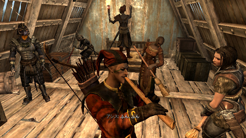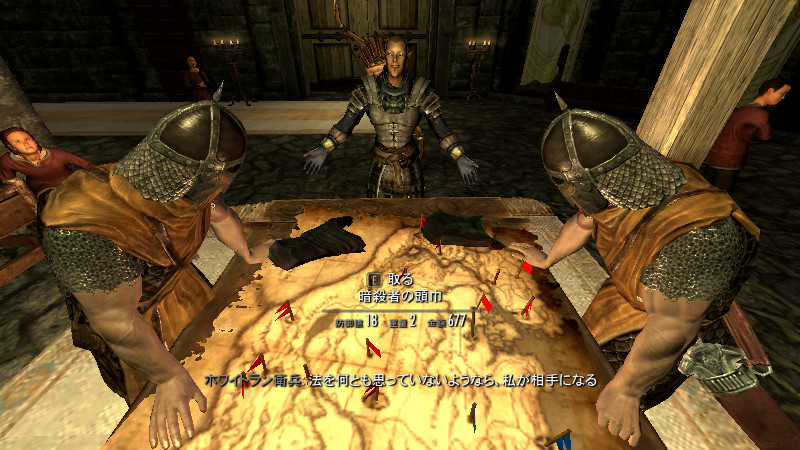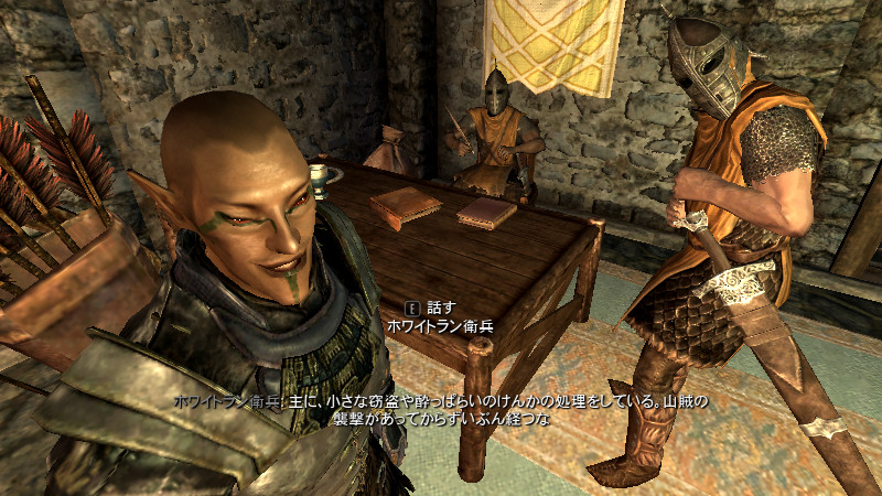 道化エルフ「……分かるヨ、衛兵のアニキ達の気持ち。ホワイトランは、地区によって“貧富の格差”が激しイ。平野地区の狭い“兵舎暮らし”には、さぞかしウンザリしてるんジャない?…たった一度の人生だヨ。私と共に平凡な立場を逆転し…盤上の“駒を動かす側”に回ってみたいとは、思わナイかい?―――虚しイ“捨て駒”の人生とおさらばして、ネ。」