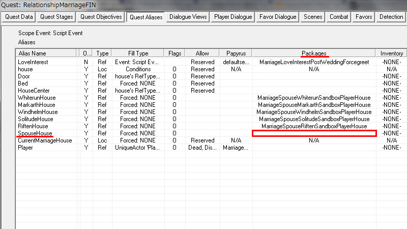 ところが、『引越し』の選択肢によって「住まい」に変更が加わると、『ScriptEvent』である「結婚生活Quest」は、生じた情報の更新時にいったん後ろに引っ込められ、持続的に走り続ける『NONE』の「ブレイズQuest」に置き換わってしまうという、『優先度の逆転』が起こるようなのです。(どことなく、CombatOverrideなどの戦闘AIの「切り替え」時の挙動とも似ています。)