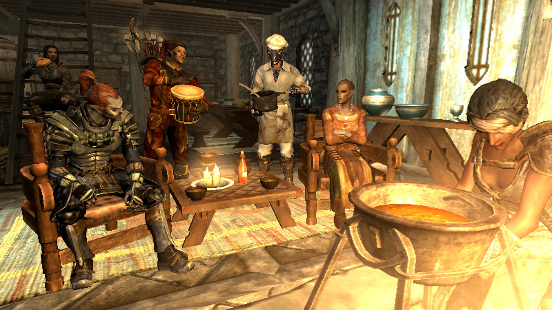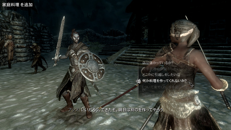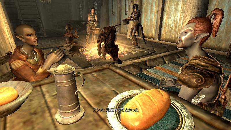 次に、「②購入した家(=ブリーズホーム)」を指定した場合、アシスは結婚生活Quest(45)の「WhiterunHouse」というAliasを被り、デフォルトのAIに従って、自宅にずっと居続け、“専業主夫”らしく振舞います。「家庭料理」を作ったり、時には夫として妻との「癒しの時間♡」を過ごしてくれます。