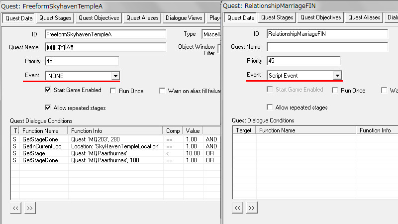 「ScriptEvent」に属していました。「NONE」はゲーム開始時から実行され特定のConditionsが揃った時に、「ScriptEvent」は先行しているQuest内のScriptとStoryManagerよって起動するConditionsが整えられ、ON/OFFが調整されているようです。この分類が、謎の違いをもたらしていると思われます。