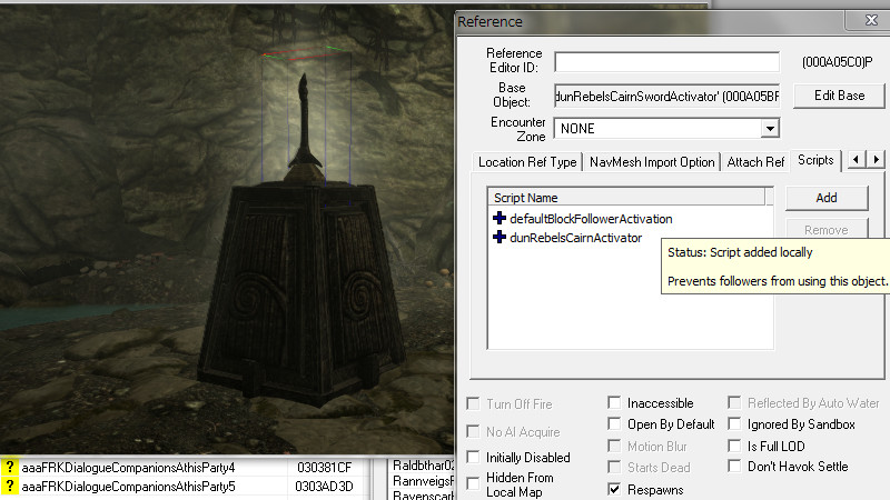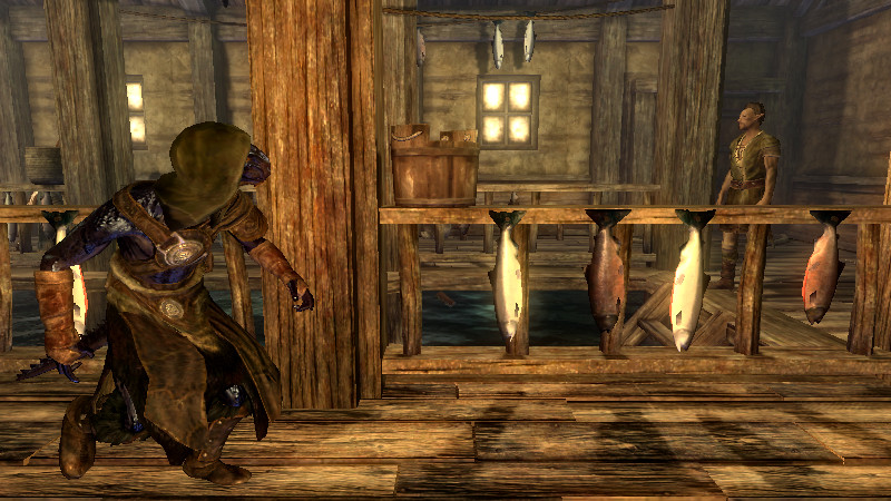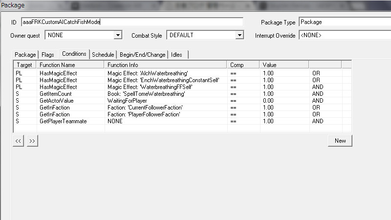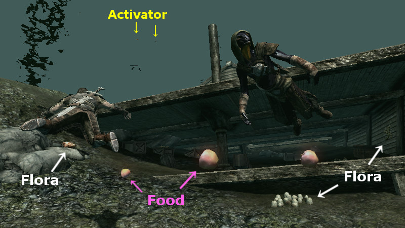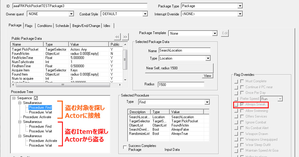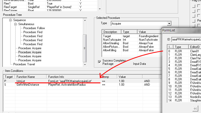 2015/06/13 Category : CK作業記録 収集系フォロワーに関する考察 ヴィルカスとアシスが「SLFollowers」のメンバーたちと『赤鷲伝説』を探る冒険を開始してから早いもので約5ヶ月…当初は「アシスの成長を描き、彼をパワーアップさせるModを一つ作る」だけの簡単な予定であり、まさかこのような長旅になるとは予想していませんでした。Mod製作を進めているうちに「こんな機能があったのか!」、「こっちも追加しよう…」と要望が増えていくにつれ、ずるずると製作ペースが長引きつつあります。結果として製作は複雑化。頭はますます鈍くなり、息抜きプレイに逃避するという始末…。そんな最中、何の気兼ねもなくプレイをしている時は、日頃バグの解決法に悩まされている時よりも発想が柔軟になるためか、今まで気づかなかったようなことや新たなアイディアがパッと閃いたりするもので…「さらにこの能力も追加しよう!」などという事態に…。まさに、負の連鎖!! ファ「おいおい…待ってくれ。鎧が重くて溺れそうだ……バグにもな(汗)」 旅している途中で…ふと思ってしまいました。荘厳な滝、流れる水のせせらぎ…「嗚呼、こんな場所でフォロワーと水辺で“魚獲り”でもできたらなぁ…」と。最近は安らぎと癒しを求めて、戦闘から離れてグラインダーで小麦を挽いたり、畑を耕すフォロワーの姿をただただ眺めたりしています。 フォロワーに「収集行動」をさせるためには、AIPackageのProcedure「Acquire」と「Activate」を使えば可能らしいのですが、このProcedureの扱いはかなり難しく、以前に挑戦した時には近くにアイテムがあるのにその場に佇んでいるだけで拾ってくれなかったり、収集の効率がやたら低かったりという問題が発生し、すっかり心が折れてしまいました。 Nexusにアップされている「The Skyrim Sweepers and The Sweep Follower System」というModを導入すれば、素晴らしいAIで収集行動をしてくれる『スカイリムの掃除人』たちが追加されるため、今まで収集に関しては掃除人達に全てをお任せしていました。 アシスのMod製作の過程で、AIPackageの製作に取り組み始めてから、少しづつアドバイスをいただきながら、AI製作のノウハウを覚えました。若干の自信も取り戻しつつあるので…『収集Package』の製作に再びチャレンジしてみることにしました。 【漁業AIPackageの自作】 Packageの構想ですが…先に述べたように「フォロワーと“魚獲り”できるPackage」を目指します。収集に関して以下の“3つの制約”を設けてみたいと思います。 ・主に『水辺のロケーション』で使用できる。 ・『海産物』以外のアイテムは拾わない。 ・プレイヤーが何らかの『命令やサインを出した時』だけ、漁業AIがONになる。 【Targetとなるアイテムの種類】 複数の種類のアイテムを収集させるためには、「Acquire」や「Activate」のTargetに単一の対象を一つ一つ指定するよりも、Procedure:「Find」を用いて周囲のアイテムを幅広く検索し、取得した検索結果であるObjectListを指定するのが便利みたいです。 Findする際にObjectListに集めるものの種類をTargetSelectorで指定するらしいのですが、『海産物』というのはどんなタイプに属しているのかが不明でした。そこで、CKのFilterで地道にどのアイテムが何に分類されているのを確認していきました。 タイプ別の『海産物』的なアイテム(Object)としては、 <Ingredient>シルバーサイド・パーチやヒストカープなどの小魚、マッドクラブの殻、ノルド・フジツボ、パール、スローターフィッシュの卵・鱗 <Food>貝の肉、サケの切り身、サケのステーキ、スローターフィッシュの焼き身 <Flora>貝、サケ(DeadSalmon)、サケ(FXAmbWaterSalmon)、ノルド・フジツボの群生、スローターフィッシュの巣 <Activator>サケ(CritterSalmon)、シルバーサイド・パーチやヒストカープなどの小魚 色々なタイプの『サケ』が居ました…。どれを指定すれば良いかが分かりにくいと思ったのですが、後々重要な違いがあることが判明しました。 ※特に『サケ』と『小魚』は同じような見た目をしていても何種類もタイプがあり、出現するロケーションにいるタイプが異なる場合、思い通りに収集できないことがあるので、その時にはこちらのケースを疑った方が良いかもしれません。 左上がActivator(Critter)。右がFlora。左下がFoodです。Mfgconsoleで確認しなければ、パッと見ただけでは識別は難しい…CritterとFloraの見た目の違いは、正直分かりません(笑) 陸に引き揚げられていて“活け締め”になっているのは確実にFloraですが、リフテン水産の水槽を泳いでいるのもFloraなので…。Ingredientは水に浮く性質があるようです。小魚などは見た目は同じですが、「水に浮かんでいるな~。あれは死んでる方(錬金素材)か…」とすぐに見分けられる良い指標です。 【収集できない時の原因】 集めたい種類別にTagetSelectorを指定して、FindをSimultaneousで並べ、全て一気に検索し、ObjectListに挙がった物をActivateで無作為に収集させるテストをしたところ、特定のタイプのみを収集してし