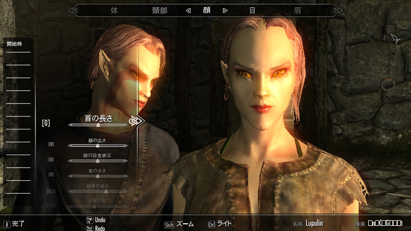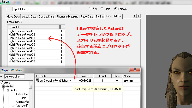 ※スカイリムのエルフ種族ではなく、ファンタジーの妖精的なエルフを作りたい場合は、キャラメイク時に「Mer系」を用いずに「ノルド」などを用いて作り、CKで新種族として、キャラの特性だけエルフ種族に似せる手法の方が顔立ちが良くなります。