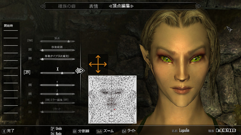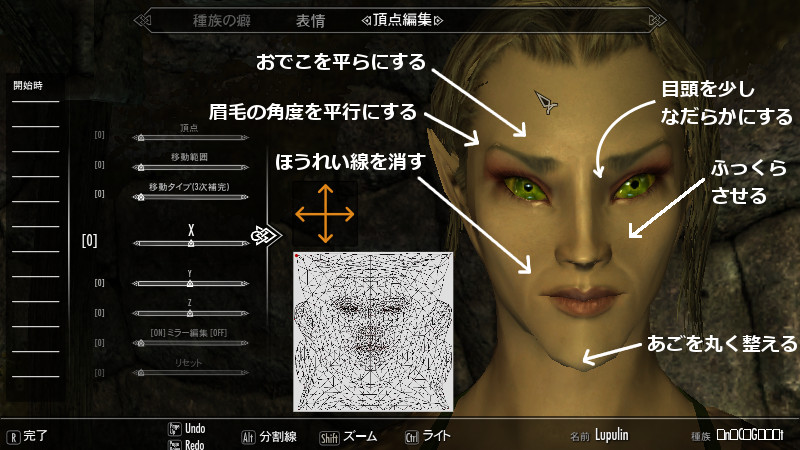 こだわるなら、おそらく『シワ』を消すために新たにスキンテクスチャを描き換えて用意するのが適切ですが、その場合は愛用の美化modの作者様の許可が必要になるか、自分で一から描く手間がかかるので、今回はECEの『頂点編集』機能に頼りました。本当にこの機能はスゴイ。しかし、まだ使いこなせていないためか…光の当たり方や一定の角度で見たときに、若干、ほうれい線が薄っすら見えることがあります。(たぶん、ハイスペックになればなるほど浮き彫りに…汗)