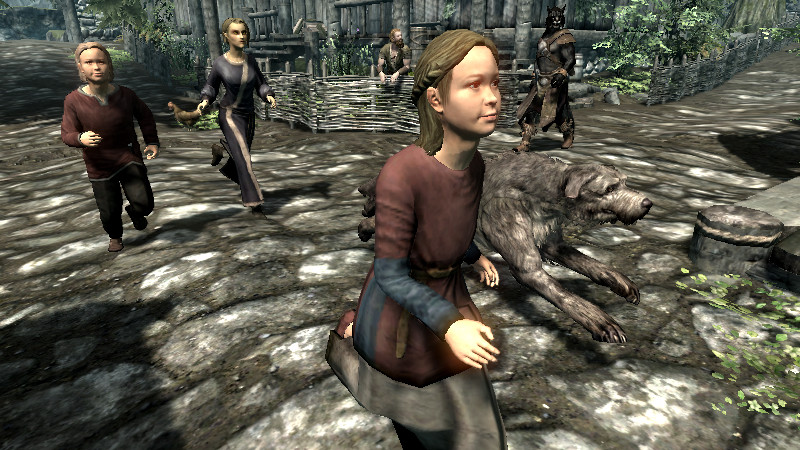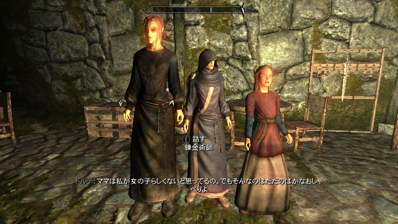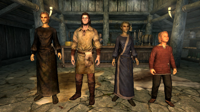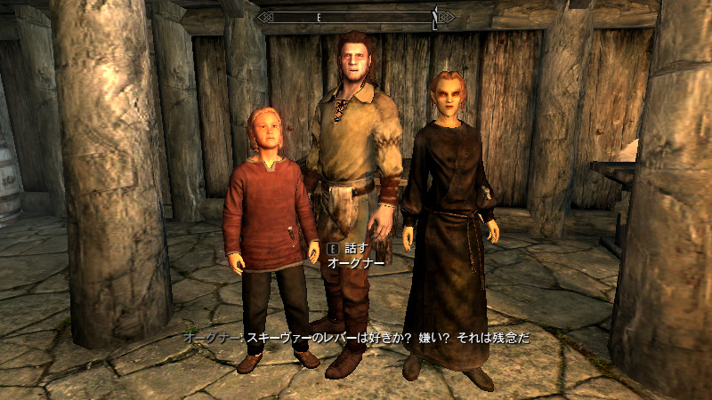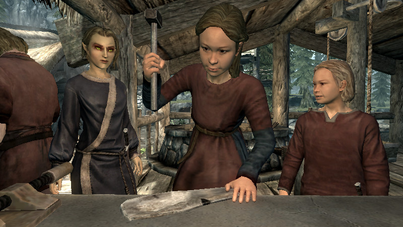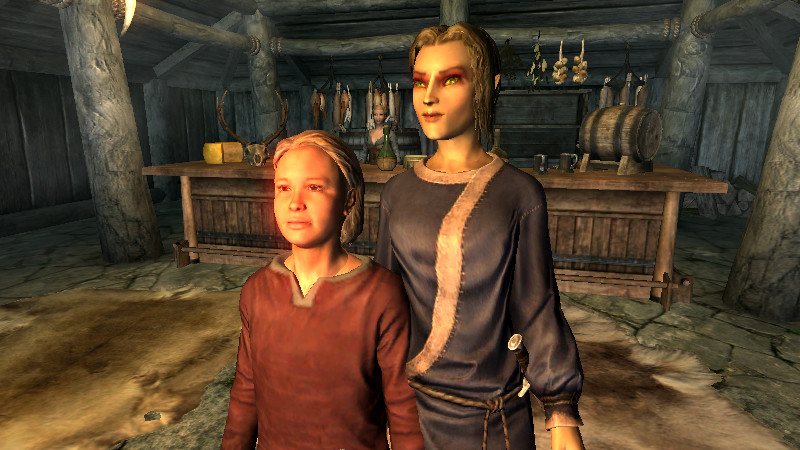 また、スカイリムには「大人」か「子供」か「老人」かの3つの年齢層の人しかいないようです。大人⇔老人の場合はしわ、髭、髪の色などで、若い人と年を重ねた人の違いが、自然に見えるようになっています。しかし、子供⇔大人になると、かなりの年齢差を感じざるを得ません…。