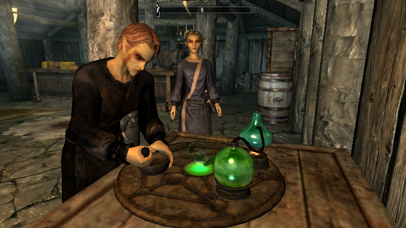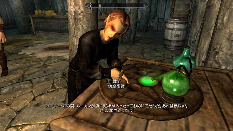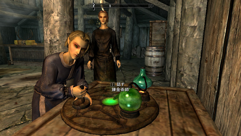また、身体を極端に小さくすると、アニメーションしたときに固定されているオブジェクトとの位置が合わなくなる(?)ためか、例えば錬金台を使った時に、乳鉢がテーブルに埋まってしまったり、イスに座った時にお尻がめり込んでいたりするのに気付きました。CKで原因を探っていると、Furnitureには「RaceToScale」というKeywordが設定されているものがあり、NPC固有の身長を変化させて、オブジェクトのアニメーションと合わせる仕組みがあり、低身長のNPCがオブジェクトをアクチベートした時は、サイズが若干大きくなって位置がきちんと合うようになっているようでした(高身長の場合は逆に小さくなる)。この現象は、種族間や男女の身長差などでは気づかないくらいの、わずかな変化だったのですが…極端に背の低いNPCの場合は、いきなり身体がニョキっと大きくなるように見えてしまうようです。
