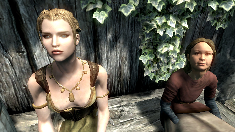 スカイリムで一番若く見えると評判の、マルカルスの「ホロキ(FemaleYounger)」さんをもってしても、「ドルテ(FemaleChild)」と並ぶと…なんとか±10歳に見えなくもない!?(錯覚?)と限界が見えてきます……。