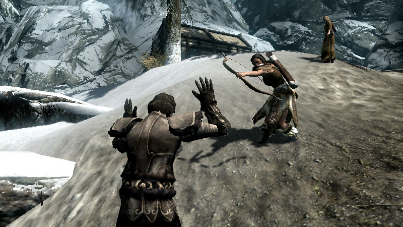 2014/11/20 Category : CK作業記録 仲間を守る!「新・補助系フォロワー」への挑戦② 【新人リアの成長】 vol.2~師匠との出会い~前編 アンジーの野営地。 ヴィルカスはリアにアエラとは異なる体系の弓術を学ばせるため、雪深い山道を越え…彼女の紹介でアンジーの元を尋ねた。 ヴィ「落ち着いてくれ!何もしないから。」 リア「練習したい。」 アンジー「私に従えば学べる事があるかもよ。」 弓の使い方を教わるリア。 アンジー「忘れないでね、平静さとスピードよ。矢が当たるのを見届けてから次の獲物に移る必要はないの。自分の一射を信じなさい。」 リア「わかったわ。」 アンジー「そこのお兄さん、リアの訓練につきあいなさい。的と的の間に立つのよ。その方が…緊張感が出るわ…!!」 ヴィ「・・・。これ…本当に……訓練に、必要か??(汗)」 (パシュッ…!!) アンジー&リア「あっ……!!」 (…プスッ!) ヴィ「ヒィッ!(…バタッ!!)」 前回作った『攻撃的回復』フォロワーのAIPackageを微調整しています。 距離間の設定とFlagsを改変しました。 【現在のPackageの仕組み】 現在のAIPackageの挙動について分析しました。 敵対者が現れフォロワーが戦闘態勢になると、「aaaHoldPosition」の交戦モードになり、指定したCombatStyleで戦います。リアは通常もDEFAULT。(検証する時はここを「csUnarmedOnly」にして、切り替わったことを確認できるようにしていました。) 戦闘中に「プレイヤーのヘルスが8割を切る」とPackage自体に設定しているConditonsにより、「aaaAggressiveHealingMode」に切り替わります。 Packageの設定。 Flagsの設定。 このモードになると、戦っていたフォロワーはいったん交戦を止め、TravelによってプレイヤーのRadius700に来ようとします。この動作が完了するとだいたいの位置関係はプレイヤー(Target)がフォロワー(Self)のRadius800以内に入っているので、Simultaneousに設定されたTriggerにより、UseWeaponのProcedureに移行。近接武器から弓に装備を持ちかえ、プレイヤーを繰り返し射撃し、回復させます。 特に制限を設けていないので、とにかくポーションを打ちまくってくれます。今の設定だと、プレイヤーが全快しているのにも関わらず打ち続けます。そして、『あるタイミング(←のちにコレが重要かつ厄介な問題を引き起こしている事に気付きましたが…)』になるまでこの動作を続けると、プレイヤーのヘルスが8割を切っていない事を認識し、再び「aaaHoldPosition」の交戦モードに切り替わります。 回復してもらうにはある程度の距離間が必要で、フォロワーと近い距離にいる時はプレイヤーに弓を向けたまま打ってくれません(Weapon Type:Rangedの仕様?)。この動作は回復モードのサインなので、少し下がって距離をとってあげると、こちらにちゃんと打ってくれます。 必要な最小距離。 【AIPackageの問題点と改善】 テストプレイをしていると、時々フォロワーが弓を引き絞って敵の足元を狙ったまま、AIがストップしてしまう問題が起きてしまいました。どういうときに起こりやすいかというと、フォロワーが回復行動に入っている際に、敵が近づいてきて攻撃されたり、プレイヤーとの距離が一定以上離れてしまった時に、この状態になってしまいます。こうなるともう、サンドバックと化します…(汗) 対処法としては、麻痺、弱フスロダ、バッシュなどを放ってやり、よろめきを発生させてフォロワーの行動を初期化してやると、すぐに復帰できるようでした。敵に攻撃されて自然に復帰してくれることもあります。しかし、対魔術師ではよろめきがめったに起こらずにそのままダウン。対戦士では短時間で大幅に削られる分、渡しておいた回復の薬をフォロワー自身でガブ飲みしてしまい…いざという時にプレイヤーを回復できなくなってしまうなんていう事態が…起こります(そういうマヌケさを個人的には楽しんでいますが…笑)このままでは賢いAIとは言えず、改善が必要です!! 最初の改善策は「UseWeapon」設定の見直しでした。というのも、TravelやFleeを使ってUseWeaponに移行する前に安全なところへ退避させたり…フォロワーの位置取りに関して色々な設定を試してみましたが…結局、敵が寄ってくるという事実は防ぎようがないためか、LocationやRadius関連の設定をいくら工夫してみても、どうやってもこのバグを抑えることはできませんでした。 そこで…コメントにいただいた「回復量を増やし、射撃数を減らす」方法を試してみることにしました(的確なアドバイスに感謝いたします!)。また、弓を上手く扱っているNPCが持つAIPackageのUseWeaponの設定から、射るタイミングや回数など何か安定性を高めるヒントが得られないか調べていきました。 そして、弓の名手「アンジー」さんがドヴァキンを訓練するQuest「dunArcherQST」から、訓練のお手本を見せてくれるためのPackage「dunArcherAngiUseBowFirst01」を本当の意味で、お手本にさせていただきました! 単純な変更で、VolleyWait(射撃後の待機時間)をMin0→5、Maxを0→6に設定しなおしました。以前のPackageはどちら