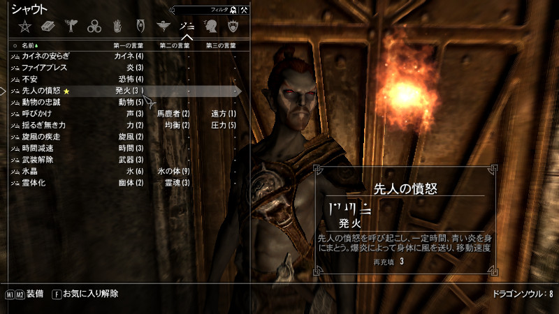 弟子「だいぶ安定して来たな!炎の流れを把握する感覚は…さすがダンマーだ、上達が早い。後は戦闘の経験によって、威力や持続性を高めていけば良い。」