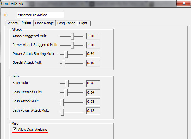 二刀流を使用する代表的なNPCのActorのデータを調べていくと、CombatStyleに特徴があることが分かりました。メルセルは「csMercerFreyMelee」、ジェナッサとラッヤは「csForswornBerserkerLow」、フォースウォーンの強者は「csForswornBerserker」、サルモールは「csThalmorMeleeDual」というCombatStyleを持っていました。全員に共通して