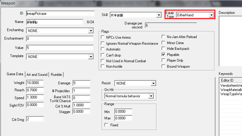 注意点として、このLeftHand型武器をCKでバニラのActorのInventoryの初期装備に直接入れてしまうと、Quest等で途中から付与される武器との相性によって、フォロワーが盾を全く使わなくなったり…、二刀流のみになってしまったり…、他Questの妨げになったり…、という危険もありますので、プレイヤーが