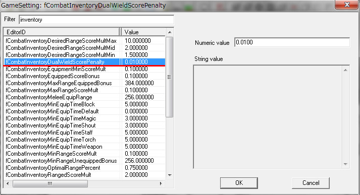 ※インベントリ内に両手武器も入っている場合、上記の片手武器の攻撃力が低く(鉄のダガーとつるはしなど)両手武器の攻撃力が高くて差が大きい時は、AIが両手武器を優先し、二刀流をする頻度が低くなりました。Meleeには「片手武器」と「両手武器」の両方の意味が含まれているようです。弓はRangeに属するので、弓を持っているからといって二刀流が妨げられる可能性は低いです。(CombatStyleのEquipmentScoreMultの方の問題)