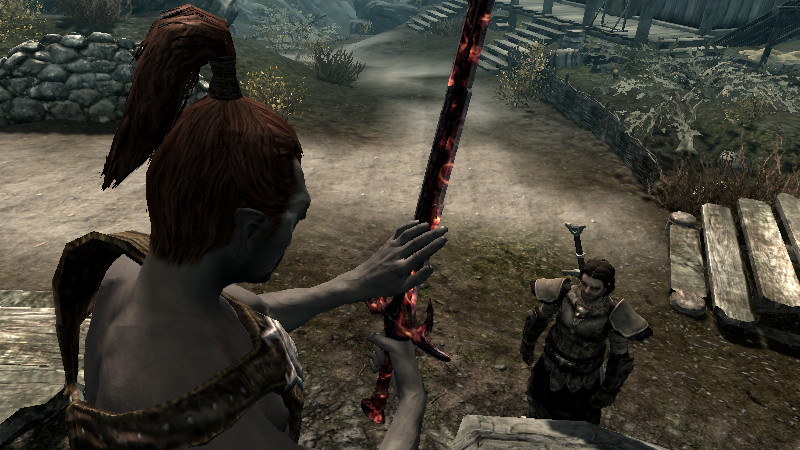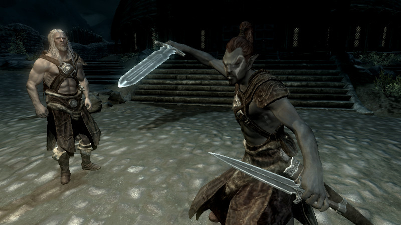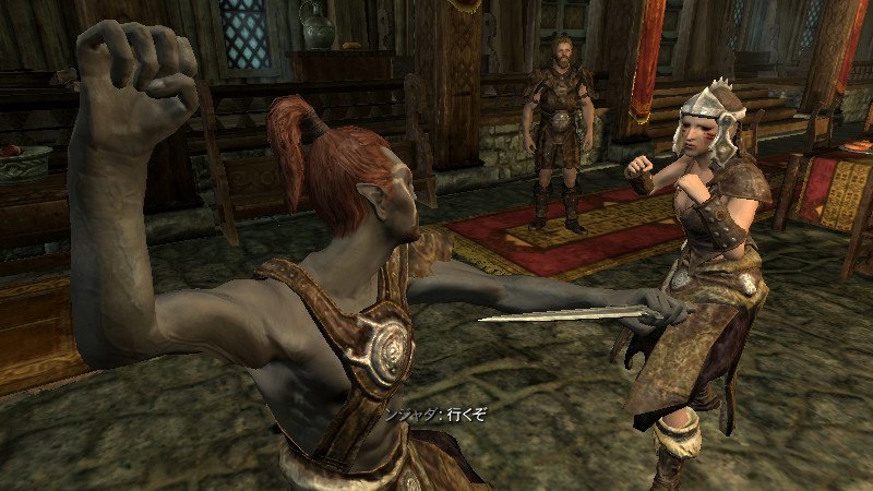 アシ「さすがは、伝説の名剣・“赤鷲”。手にしただけで、憤怒の力が呼び覚まされそうな感覚だ!!…最近は時間のある時に、ドヴァキン達に“二刀流”を教わっている。以前の俺は『個人的には、小さくて素早く使えるのがいい』とかほざいていた割りに、二刀流はできなかったんだ。」