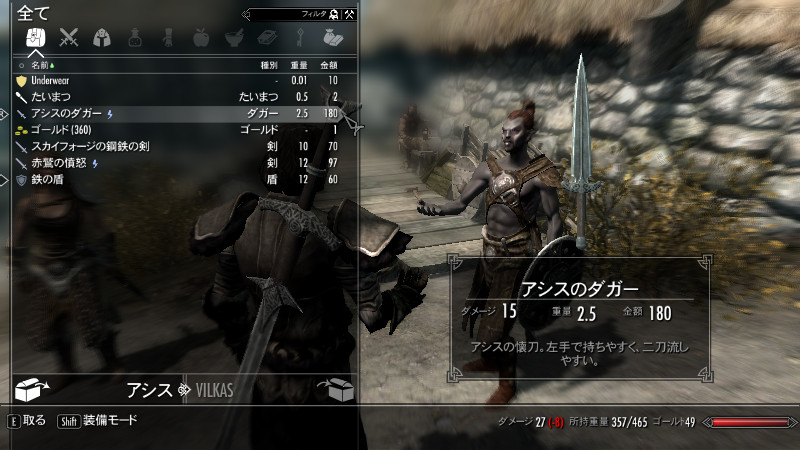 アシスで試したところ、同胞団Quest冒頭の「ジョルバスクルでのンシャダとの殴り合い」で、おもむろに懐からナイフを取出し…左手に装備してグサリ!!という事件が起きてしまいました。彼らはScriptによって武器(スカイフォージの剣)を取り上げられた状態で、安全に殴り合いをしていたようです。Propertiesで初期装備の武器が直接指定されていたので、自作したダガーは対象外になってしまうようでした!(危)