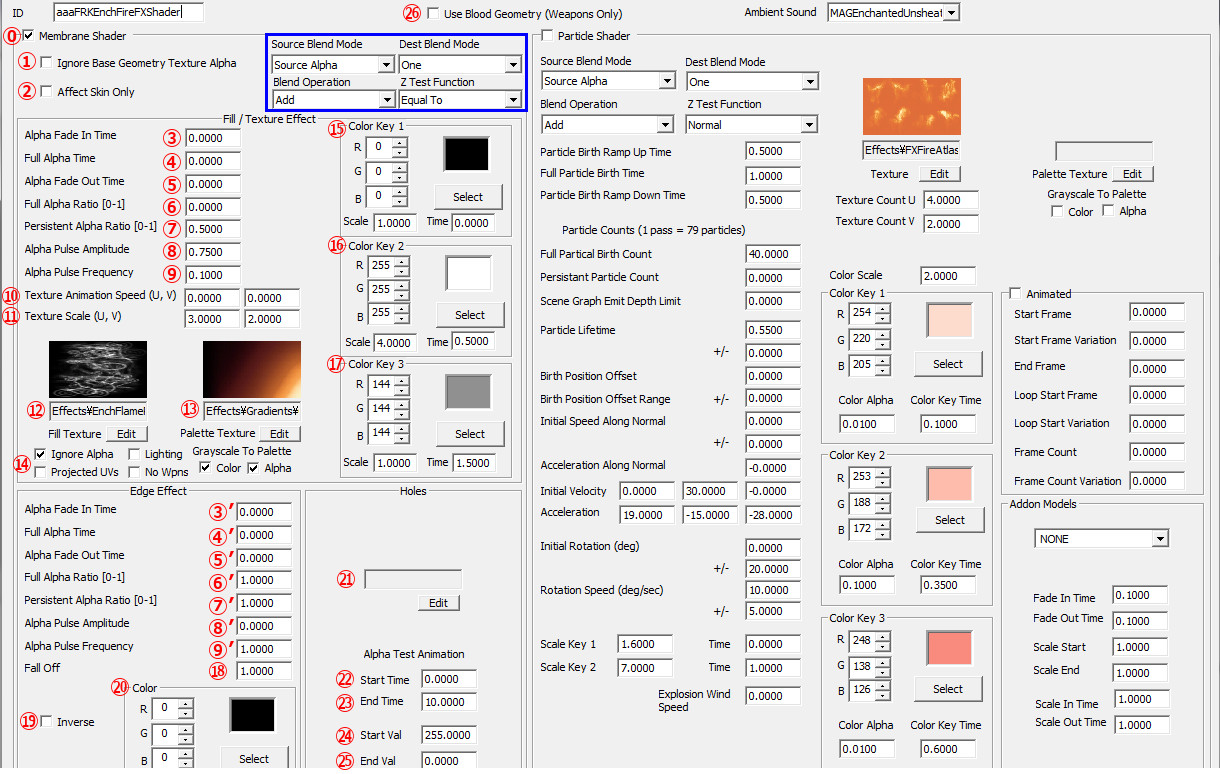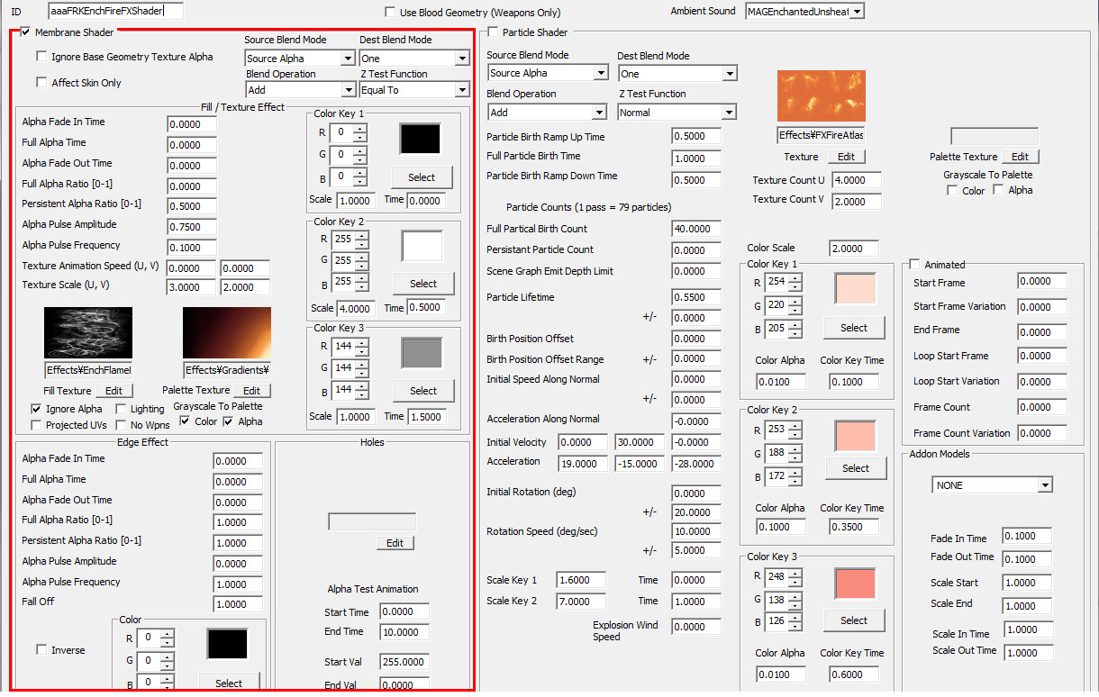 ・NoWpnsは、「武器にエフェクトを適応させない」。そのはずだが、チェックした場合も付呪武器にはエフェクトが出ていたので…良く分からない項目。フレッシュ系魔法に使われていたので、おそらく全身に効果が出るエフェクトにおいて、武器のみを除外する項目だと思われる。