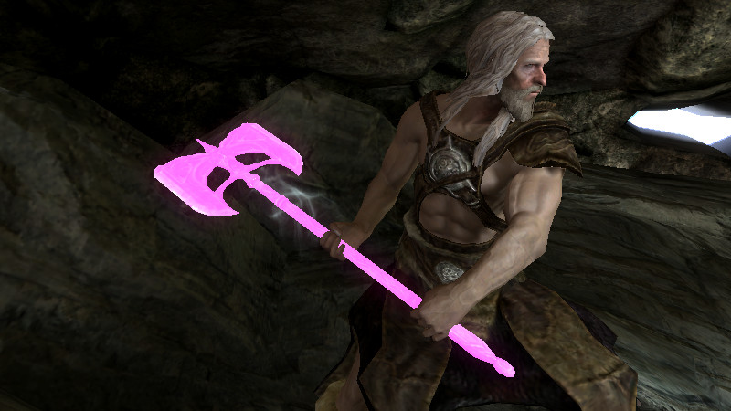 PaletteTextureの“色”がどのようにブレンドされているかを調べるために、単色のピンク色のddsファイルを用意して、指定してみました。3つのチェックボックスが☑になっている時は、実験3と同様に…武器がピンク一色になりました。