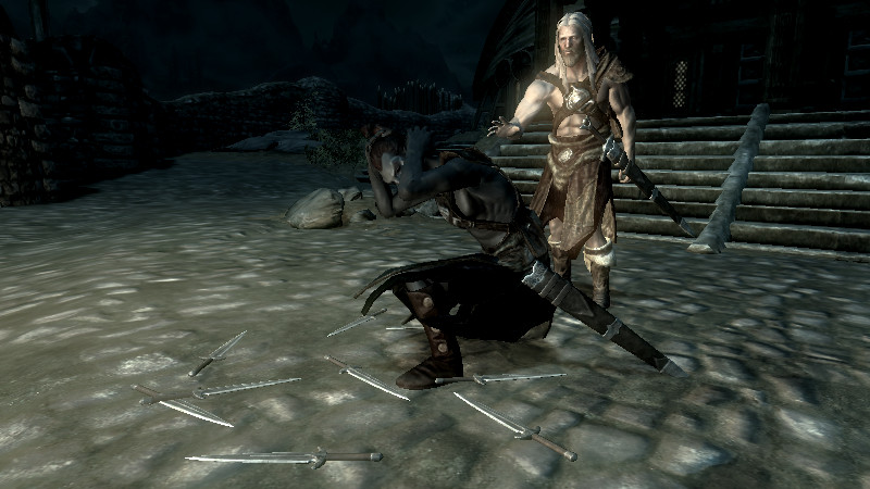 シャウトを用いた二刀流切り替えには、難しい課題があると判明しましたが、武器がいったん手から離れれば消えるため、既存のCombatStyleが弓や魔法などの遠隔攻撃を得意とするタイプで持ち替えを頻繁に行ってくれる場合や、「カスタムAI」と併用してUseMagicで魔法を装備させたり、UseWeaponで両手武器や弓を一時的に使用させるようにすれば、使えなくはない方法だと思います。Package自体を切り替える方法でも可能かもしれません。しかし、カスタムAIを使うのであれば…わざわざシャウトにする必要性があまり無いので、Spellのままで良いということになってしまいます。