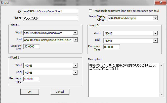 Wordには「力の言葉」を、Spellには「召喚したい武器」を自作して設定。RecoveryTimeは30秒にしました。上手くいけば、①戦闘開始→②シャウト→③二刀流化→④30秒経過後に消失して一刀流に戻る→①'RecoveryTimeで再びシャウト可能になる、という流れになるはずです。