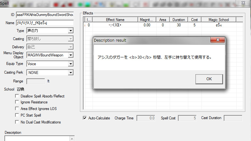 詳細に既存の召喚魔法と見比べてみましたが、SpellやMagicEffectの設定には大きな違いがありません。ということは、召喚するWeapon側の設定に何らかの原因があると考え、EquipTypeを「LeftHand」から「RightHand」や「EitherHand」にした時にどうなるかを確認しました。すると、「RightHand」や「EitherHand」にした場合は、シャウト化しても時間が経てば、正常に消失しました。「EitherHand」は、シャウト化した際にどちらの手に召喚されるのか?も気になっていたのですが、シャウトすると武器が必ず「右手に召喚」された事から、「左手が塞がっているとRightHandとして扱われる」という前回の予想が当たっていました。消えなくなるのは『LeftHand』の武器をシャウトで召喚しているからのようです。あくまで推測ですが、呪文でLeftHand型を召喚した時には、通常通りに召喚と消失が機能していることから考えると、召喚を行うスロットと武器を扱う(装備する)スロットはワンセットに紐づけられて処理が行われている可能性があります。一致していない時に、「時間経過」や「抜刀/納刀」によって消すという処理自体が存在していないのだと思います。全体的に「RightHand」が最優先される仕組みになっているため、シャウトにした時にも偶然(奇跡的)に、「時間経過」の消失が適応される不思議な現象が起こるのかもしれません…。
