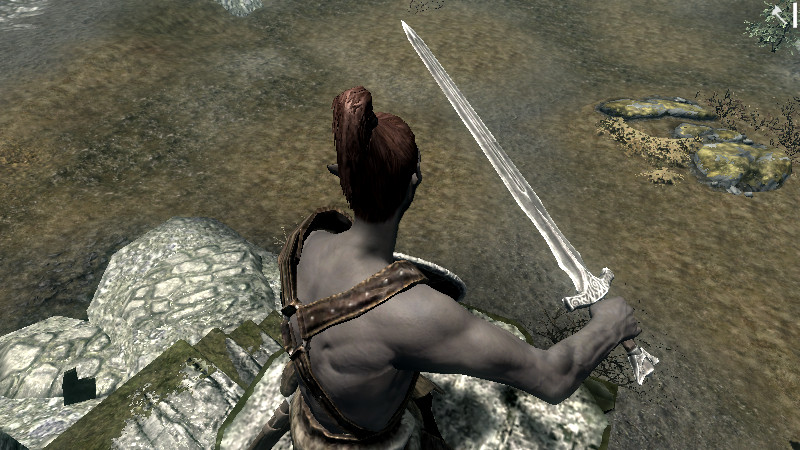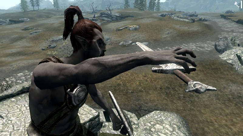 ―――予想よりも良い!!手に呪文を装備する隙を作らずに、武器を持ったままキャストを行えます。シャウトすると同時に、左手に持っていた盾が強制的にはずれ、自作アシスのダガー(左手専用)が召喚されて、置き換えられました!しかも、持ち替え方がカッコイイ!手を前に突き出し、下から上へ武器が吸い寄せられるようなモーションになるので、「Spellバージョン」とはまた違った印象になります。