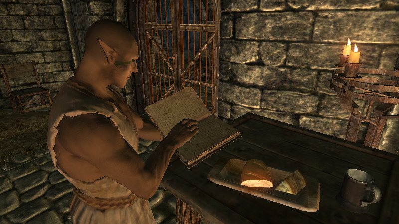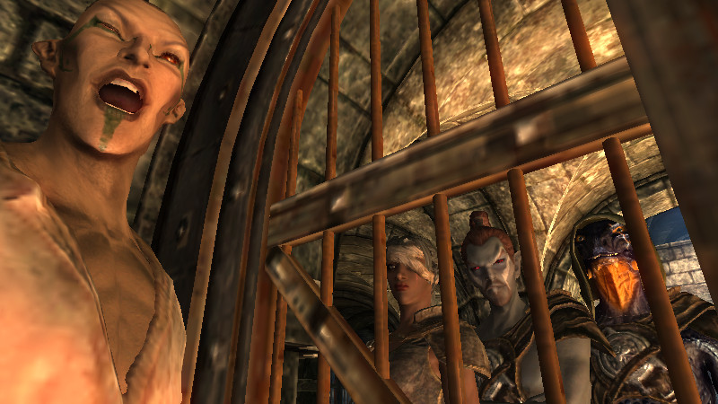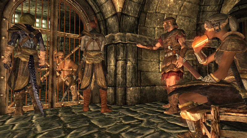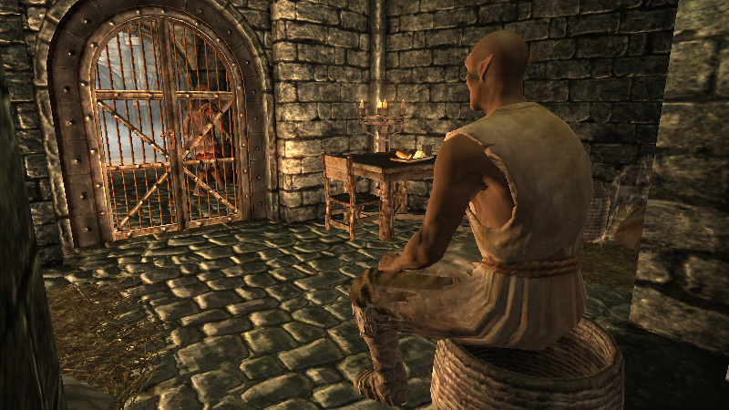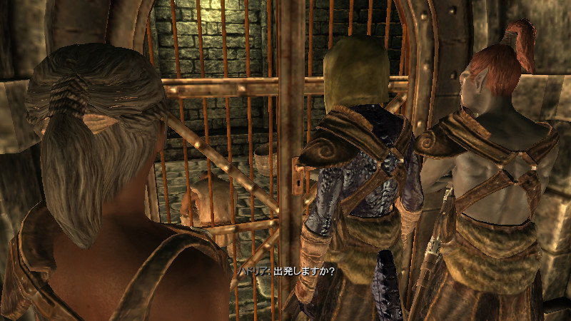 ※フォロワーは刑期を終えるまで、ドール城の入口に待機しているはずですが…Modで既存のFollowerQuestと別枠で雇用した影響からなのか、牢の近くまで会いに来てくれました! 彼らは抜け道の“モルタルの壁”の向こう側からやって来ました。(…案外、健気な奴らだ……涙)