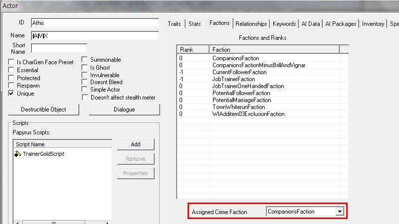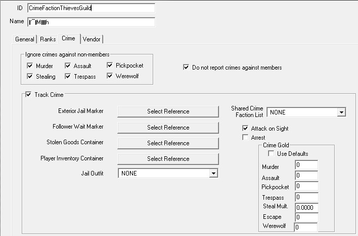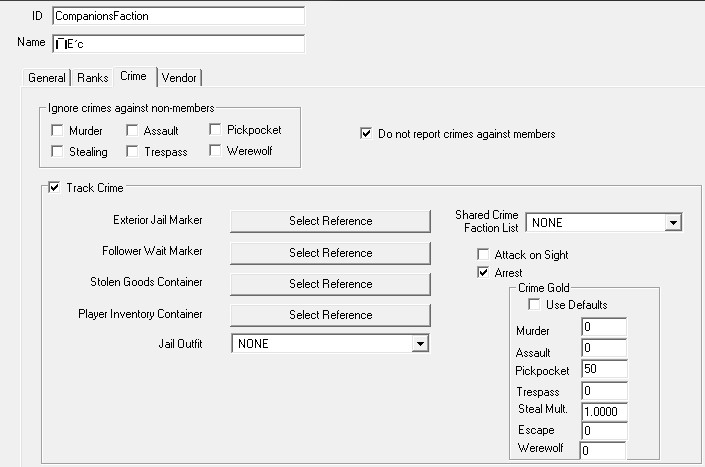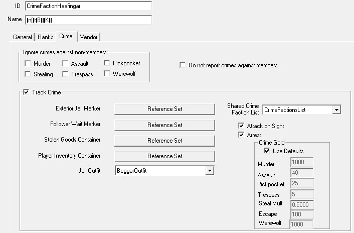「AssignedCrimeFaction」の所に指定されています。ここが「NONE」になっていると、犯罪行為に個人的に対応することしかできなくなります。(報告・救援・犯罪の記憶・共有が不可)