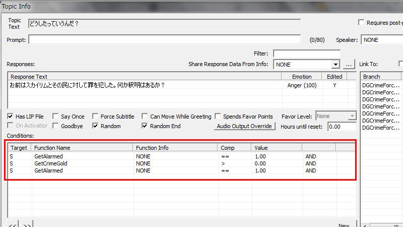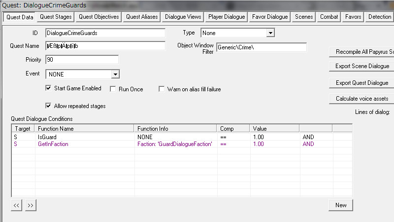 「DialogueCrimeGuards」というQuestに着目しました。衛兵との対話に関するQuestです。QuestDialogueConditionsを見てみると、