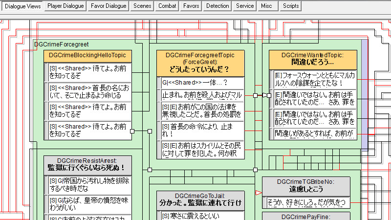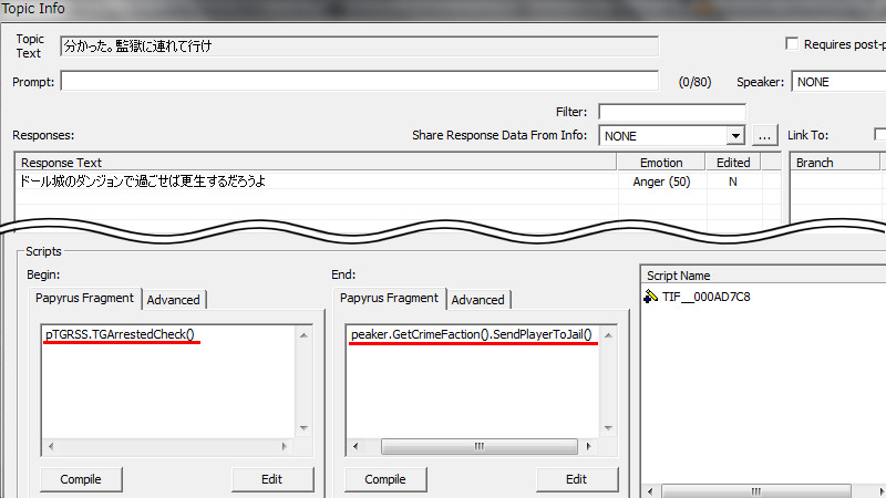 『PapyrusFragment』が組み込まれているものもあります。プレイヤーの返答に応じた台詞の発生と共に、「ゴールドを徴収」、「監獄へ送る」、「逮捕に抵抗した者とみなす」などの処理がScriptによって行われる仕組みのようです。