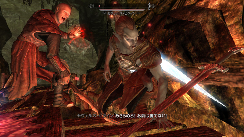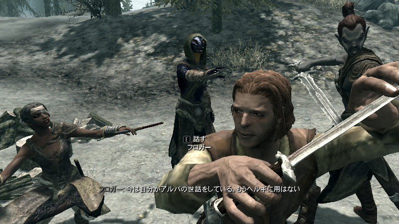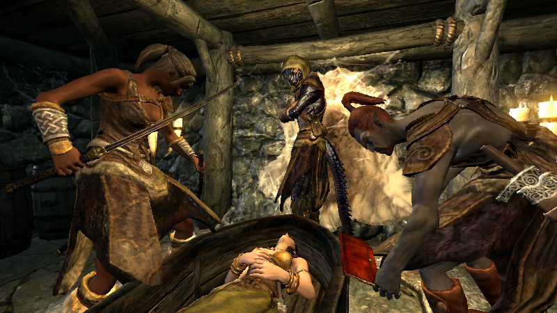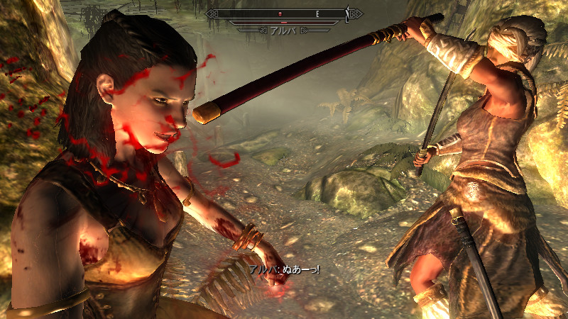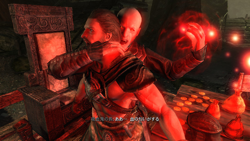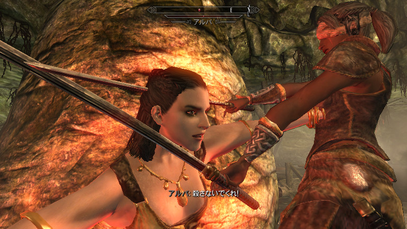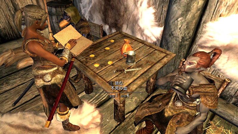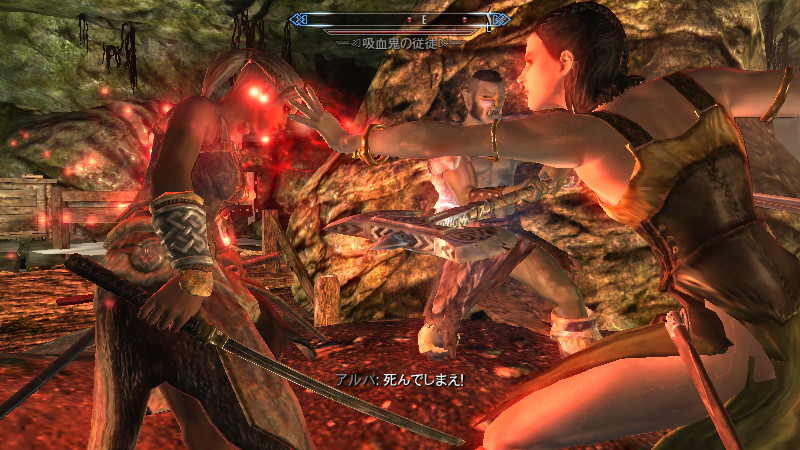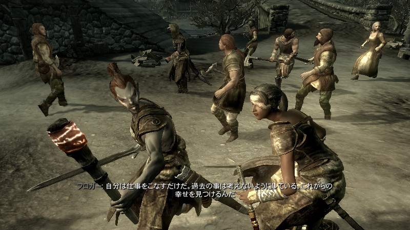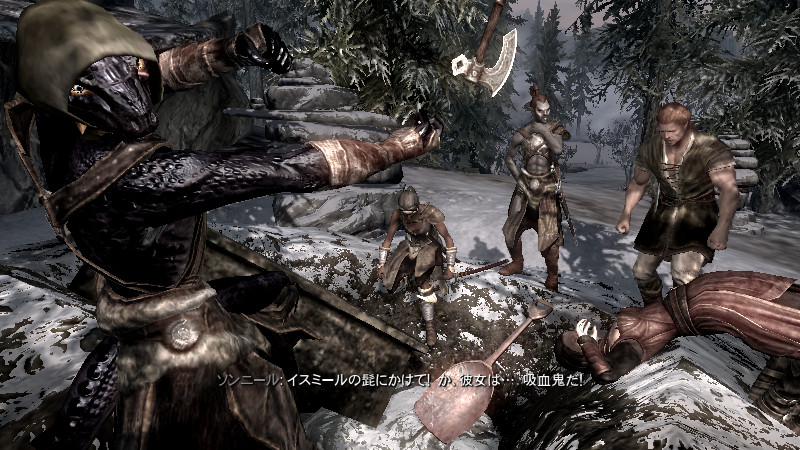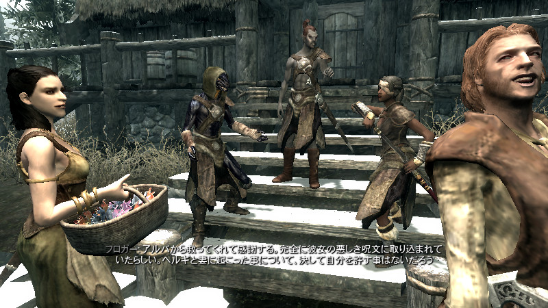 ……逝った。すぐさま物陰から、ガチムチのノルド男が駆け寄って来ました。(後をこっそりつけていたのか?)村人のソンニール氏でした。吸血鬼の女性は、行方不明になっていた彼の妻。特に…ヴィルクマンド君、すまない。もう、手遅れでした……m(_ _)m