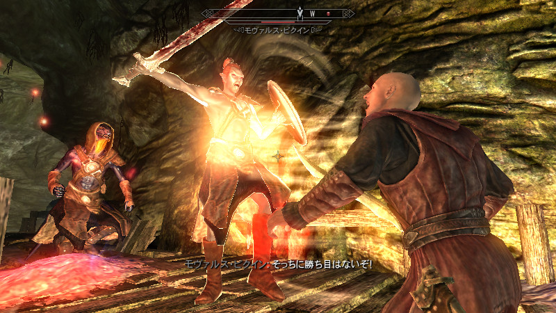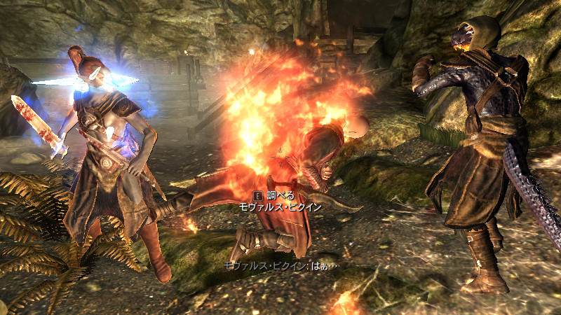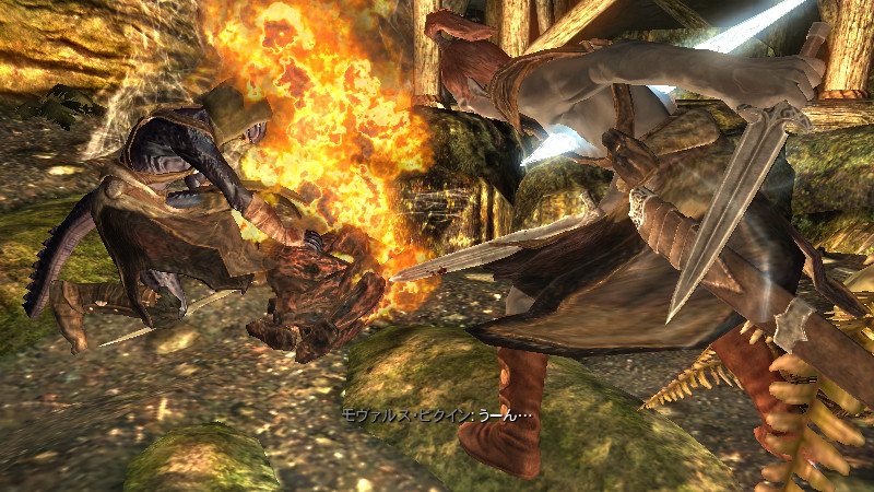 モヴァルス「グハッ!!(今のは……何だ?!奴の剣は、“付呪武器”では無かったはず…。が、今のおれは…『第3段階』。未知の獲物に“虚”を突かれぬよう、狩人の血を吸い……“炎耐性”を戻しておいたのが、吉と出た…!)」