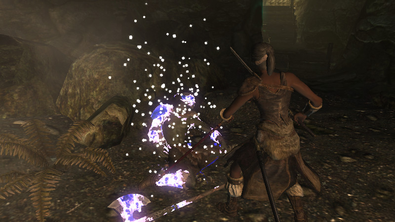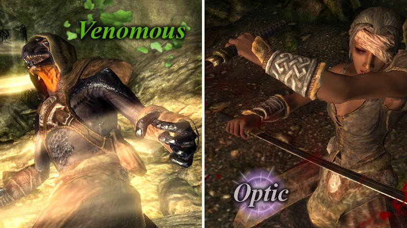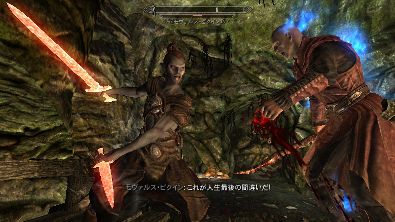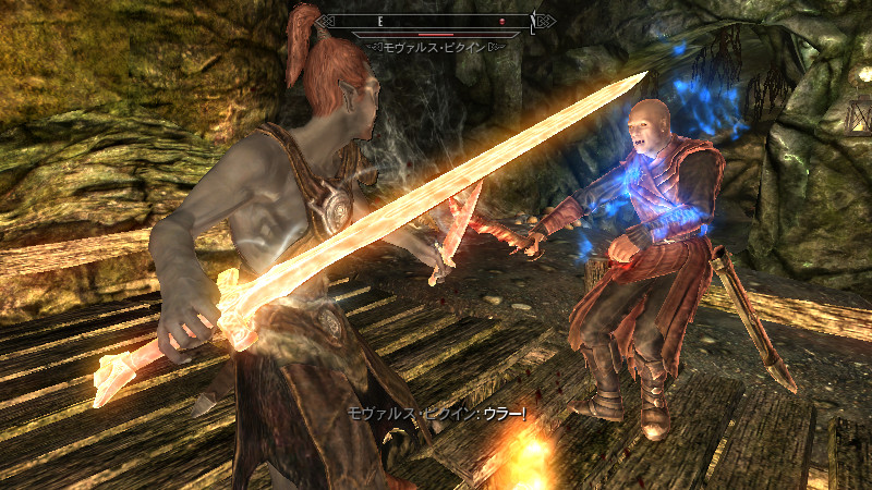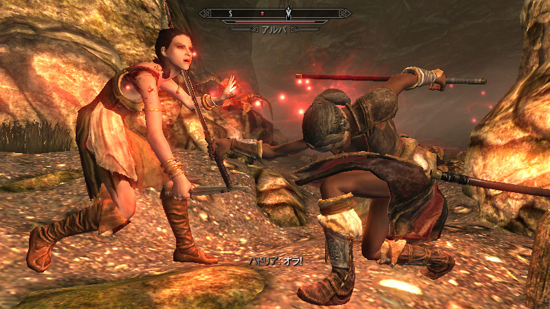 「毒を滴らせる手」を持っています。『ApplyCombatHitSpell』は、「武器のみに適応され、素手にはPerkの効果が反映されない」という特徴があるようです。シャウラス等の毒攻撃を模した「接触毒」のSpellをここに指定しましたが、素手にも適応させるには、ActorのAttackSpellのH2H(素手攻撃)にも、指定する必要がありました。なお、この方法は付呪武器へも“上乗せ効果”を発揮するため、短剣装備時には「付呪+毒」の強力な攻撃となる可能性も。もちろん、毒を出せない場合もあります。(発生頻度:中)