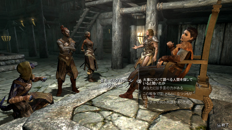 首長イドグロッド「ホワイトランから、遠路はるばる来てくれたのかい?、同胞団よ…この年寄りの目に狂いは無かったようだ。外から来たあんた達なら、真実を突き止められるかもと思ってね。―――もしあいつが有罪か無罪かを明らかにしてくれたら、謝礼を払うよ。」