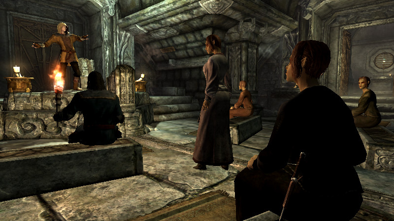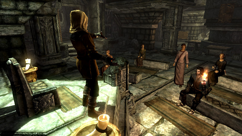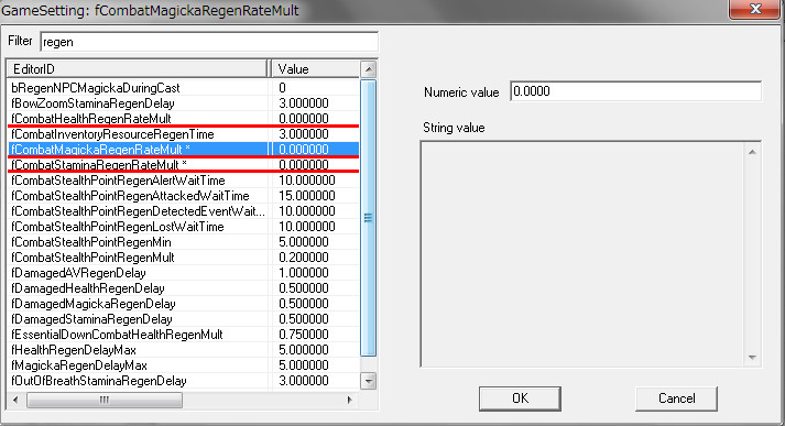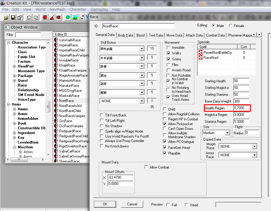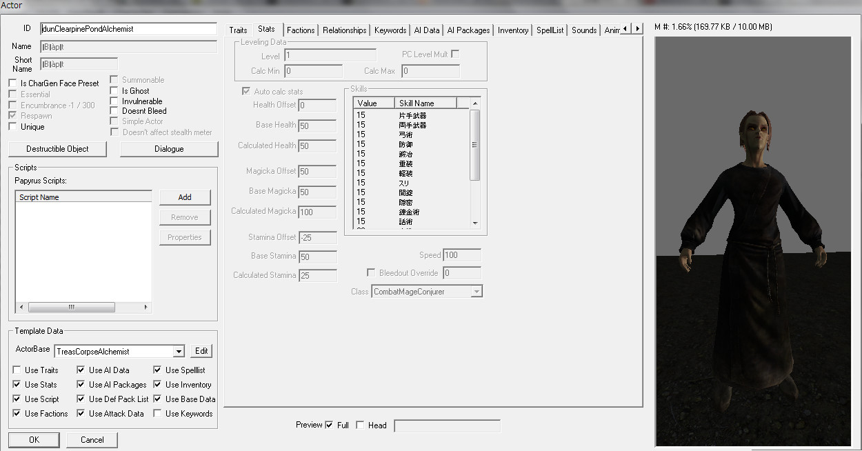 2014/10/05 Category : プレイ日記 耐性とは…何なんだ?③ ~【プレテスト】~ 魔法耐性の解明のため、予備知識を学んだファルカスは、弟子と共に検証の準備を開始する…! 実験に向けて軽装に着替える二人。 ファ「すばらしい!!着心地は抜群だな!いつもの倍の速さで動けそうだ。」 弟子「似合っているぞ。スカイリムの最新スタイル、洗練されたデザインと実用性を兼ね備えた防具だ。そして、私が大好きな黄色だ。」 ファ「それで…何から始める?実験の概要を教えてくれ。」 弟子「ふむ。まず、我々二人だけで行えることは限られている。二人で魔法をぶつけ合っていても身が持たないし、耐性値をコントロールするための着替えや魔法の取捨は、今後の実験で一番面倒な作業になるだろう。それに私は『フォロワー』だ…。短いスパンで4回以上攻撃され続けたら、逆上して殺し合いになりかねない。」 ファ「たしかに…あんたのキレやすさは…異常だ(汗)。危険だな。」 弟子「そこで、各地から優れた『錬金術師』を志す者たちを探してきた。この実験の協力者として秘密裏に参加してもらうことを約束している。すでに奥の部屋に待機しているはずだ。…紹介しよう、『錬金術師・四姉妹』だ。」 ファ「よろしくな。でも何故、魔術師ではなく『錬金術師』を選んだんだ?」 弟子「熟練した魔術師というのは皆、自身のスキルにうぬぼれている者が多い。今回の実験には、『まっさらな状態の者』の方が適している。それに魔法耐性の試験の後には、『薬や毒』の実験も考えているからだ。」 ファ「なるほど…。」 弟子「彼女たちはこの実験を行うのに最適の人材なのだ。正式な名前は『dunClearpinePondAlchemist』と言ったかな?駆け出しの錬金術師だけあって、全員Levelは1。種族はハイエルフで、破壊魔法に影響する種族特性や余計なPerkを取得していない。」 ファ「そんな都合のいいNPCが存在していたとは…。」 弟子「私も彼女たちのポテンシャルには驚いたよ!話を続けるが、当然…この実験には魔法を『かける側』と『受ける側』の二つの視点を考慮しなければならない。つまり、『プレイヤー側』と『NPC側』の耐性実験が別々に必要となる。」 ファ「ま、まさか…俺を連れてきた理由はそれか…!(汗)」 弟子「フハハ。君は脳筋だけあって、同胞団でもトップクラスの頑丈さがあるし…きっと大丈夫だろう(笑)」 ファ「(コイツめ)・・・。」 弟子「さらに、念頭に置かなければならないのは、我々の持つ『自然回復』だ。日頃はこの恩恵に与っているが、今回の検証で正確なダメージ量を算出するのに、これほど厄介なものはない。そこで、戦闘中に自然回復をしないようにするmodを準備した。」 ファ「どうやったんだ?」 弟子「CKのGameSettingでFilterに『regen』と入力すると、回復に関する各種設定が出てくる。その中で、『fCombatMagickaRegenRateMult』と『fCombatStaminaRegenRateMult』に着目した。これらの値を0にすると、『プレイヤー、NPCともに戦闘中にマジカとスタミナが自然回復しない』状態になった。これは実験するのに非常に便利なのだ。ダメージを与えた後、コンソールから『resetai』を実行することで、『敵対を解除』して戦闘を終わらせれば、次の実験に向けて勝手に回復してくれるのだ。」 「だが、一つ問題があった。見ての通り『fCombatMagickaHealthRateMult』は最初から0に指定されており、デフォルトで戦闘中に人間NPCはHealthの自然回復をしないので、Healthの自然回復に関しては考えなくても良いと思ったのだが…プレイヤーは何故か自然回復していることが判明した。(例外:トロールなどのクリーチャー系NPCの自然回復は有効になっている)」 ファ「俺の生命力は大したものだろう。」 弟子「まったく…この解決策を見つけるのは一苦労だったぞ…!」 「結論から言うと、Raceの項目でそれぞれの種族の詳細設定がされているのだが、そこに答えがあった。」 弟子「君(プレイヤー)はノルドだから、NordRaceを詳しく見ていったんだ。すると、『General Data』タブに『Health Regen』という項目があることに気づいた。ここを0にすると、プレイヤーを含め、ノルド種族は自然回復しなくなったのだ。」 ファ「無事、解決したな!」 弟子「あとは…君(プレイヤー)自身の魔法関連『スキル』だ。スキルレベルが高かったり、特定のPerkを取得しているとダメージ値に大きく影響してしまう。魔法のダメージを減らす防御系のスキルとかな…。特に『破壊』の魔法スキルは一時的に忘れさせてもらうことにした。」 ファ「折角、鍛練してきたのに?今までの苦労は、一体なんだったんだ…(落胆)」 弟子「コンソールからの一時的なものだよ。心配するな、あとで元に戻してやろう。」 弟子「実験環境のプレテストと、余分なファクターの排除については以上だ。では、実際に魔法耐性の検証実験を開始しよう。研究所の奥に付呪台のある広い部屋がある。着いて来てくれ。」 ファ「いよいよ…だな!!盾の兄弟として腕を振るおう。」 …つづく。 [1回]P