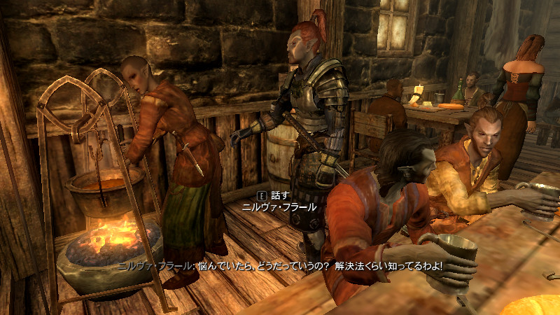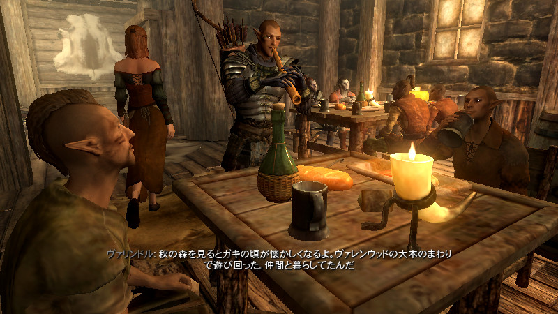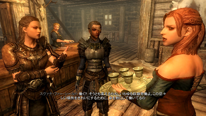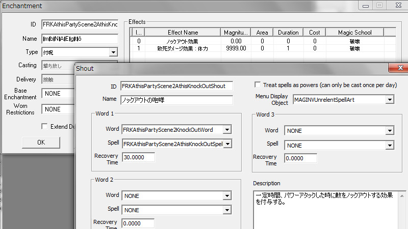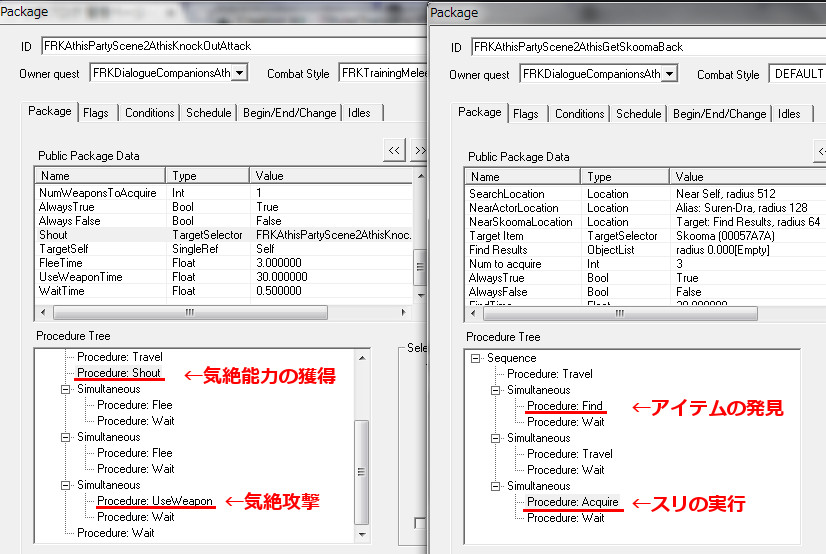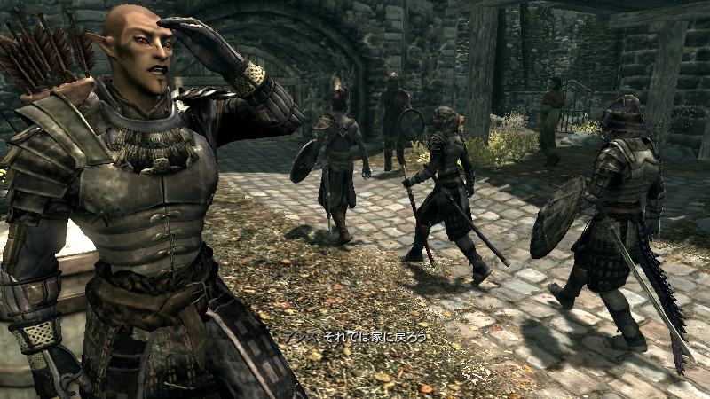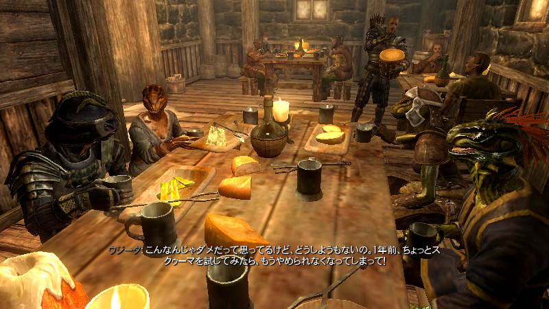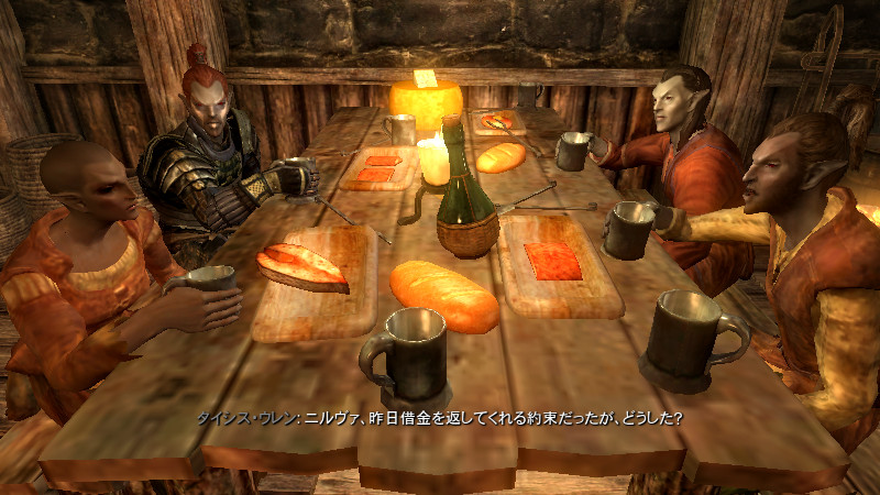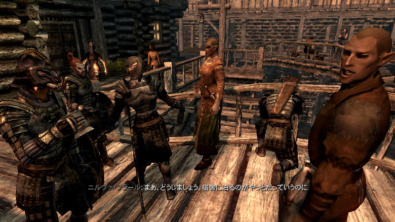2015/08/23 Category : プレイ日記 自作Modのテストプレイ⑦ アシス達がブレイズに入団したことをきっかけに、自作AIの優先度に従って勝手に行動していた彼らを適切に誘導できるよう、「同胞団」と「ブレイズ」という2つの派閥を『掛け持ち』するための方法を考えることになりました。解決策に行き詰っていたところ、「Questを分割する」という素晴らしいアドバイスをいただけたおかげで、フォロワーAIの複雑な構成が可能になりました! 大きな成果として、Quest同士の相互関係を利用した製作に、理解が深められたように思います。 登場回数の乏しいNPCに「ブレイズ」などの肩書を与えることで、彼らにイキイキとした人生を歩んでもらうことができます。その一方で、プレイヤーの“相棒”として、複数の役割を担当させ、どんな時も行動を共にしたい、特別な存在のフォロワーもいると思います。そのような場合に、『Quest連動型AI』を作成することによって、フォロワーのAIに条件の変化に応じた判断を行わせ、様々な立場を交替で活動してもらうのも、これまでとは違った新鮮さがあると感じられました。 “あらゆる組織に加入することができる、”プレイヤーほどの特権を持つことはできませんが、スカイリムの“複数のギルドをまたにかけて行動するフォロワー”が現れたら、強力な助っ人になりそうです。それとは逆に、立場を伏せて敵組織に潜入していて、ある日突然裏切りを働く“スパイNPC”なども居たら、緊張感のあるロールプレイを楽しめそうな気もします。 テストプレイの確認ポイントのうち、『ブレイズ』の項目を無事にクリアすることができました。次は、もう一つの待望(?)のテーマである―――フォロワーの『結婚』について、調査を開始します。 戦いを積み重ねる内に、貫禄と渋味が出てきたアシスの「※“花嫁”になるのは、果たして誰なのか?」。様々な派閥に属しているフォロワーの「結婚後の生活がどう変わるのか?」。そして、「自作Modとの関係性」について、お楽しみプレイと共に入念にチェックをしていきます。 ※花嫁役として、プレイヤーが一時的に“あるNPC”の役を演じながらアシス(フォロワー)と結婚する予定です! 『結婚』は、離婚や再婚ができないスカイリムでは…“人生たった一度限りの重大イベント”! またもや、テストプレイの方が疎かになってしまいますが、この機会を盛大に楽しんでみたいと思います。 【マーラが微笑みますように!】 vol.1~恋の予感~ 冒険Packageの旅日程が終了し、数日後にスカイ・ヘヴン聖堂に帰ってきたアシスは早速、デルフィンからの“愛の鞭”という名の“お仕置き”により、強烈なトラウマを植え付けられることになった。 (……ヒュォォォオ~……) ハドリア&スレン「隊長……。(明日は我が身だ…)」 (メキメキメキッ×2……ジタバタ×2……) アシス「グェーッ!!!…がはぁっ…が…か…(落ぢるッ…斬られ゛るッ……息がでぎないッ…お助けを゛……)」 その光景を目の当たりにした、新人2名。彼らがブレイズの任務中に、勝手な理由で行動することは……金輪際ないと思われる―――。 反省と自戒の念を込めて、同胞団一行はデルフィンからの、「※ドラゴン狩り」へ行って来い、という指令を快く引き受けました。 道化エルフ「・・・。(ドラゴンを倒すことが義務化し、いつの間にか…彼らの中だけでどんどん話が進んでいるッ!それに…異様なまでの、“してやってる感”。…ドラゴンボーンは戦いにおいて、常に一対一でケリを着けなきゃいけナイ伝統でもあったのか??自分たちは決して現地へは赴かず、新人をこき使ってイルというのに。…元祖ブレイズ、いや…彼らはもしや、精神がブレないという意味の…“ブレ~ず”なのかもしれン!!)」 ※ブレイズの「ドラゴン狩り」のQuest、「FreeformSkyHavenTempleB」(Priority=46)が開始されると、非雇用状態のフォロワー達は、一斉に現地に向かって走り出しました。現在、同胞団の活動を「月・火・木・金」、ブレイズの活動を「水・土・日」に設定していますが、いずれのAIにも影響されることなく、プレイヤーがエズバーンから依頼を受け取った瞬間に、どちらの場所に居たとしても現地に集合してくれました。(自作Modによる悪影響が出なくて良かったです!) エズバーンに「ドラゴンスレイヤーの祝福」を授けてもらい、“ボーンストレウン山脈”へ向かいました。たった4人だけで、巨大なドラゴンに立ち向かって行く宿命を背負っているなんて…ブレイズって、本当に恐ろしい秘密組織です(ブラックすぎる)。それゆえ、ドラゴンボーンのレベルに着いて行ける精鋭や、ずば抜けた戦闘能力を持った選ばれし者のみが生き残り…入団を許可されたり、日常に厳しい制約と戒律が設けられていたりする側面があるのかもしれません…。 しかし、割とあっさりドラゴンを仕留めてしまう同胞団。アシスを始め…彼の「Class」から派生したステータスを持つ同胞団の新人2名は、『片手武器適性』と『重装適
