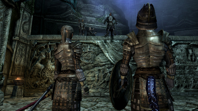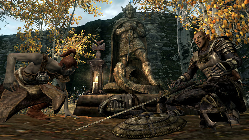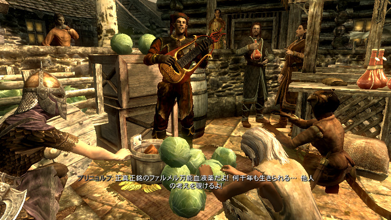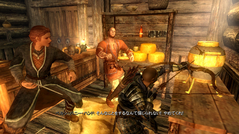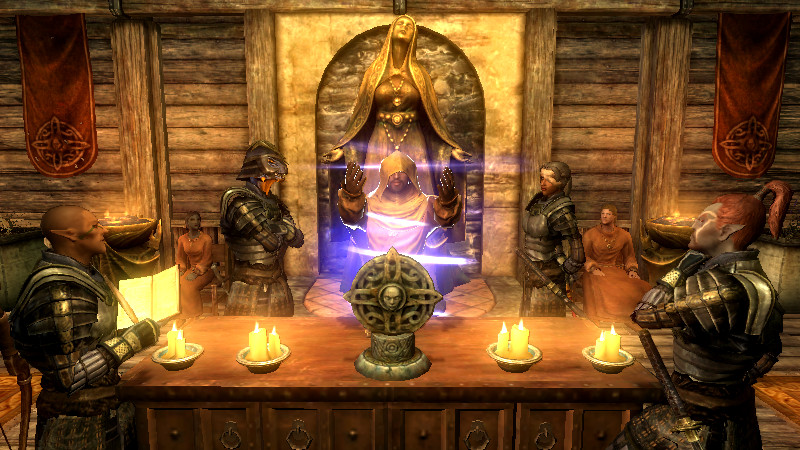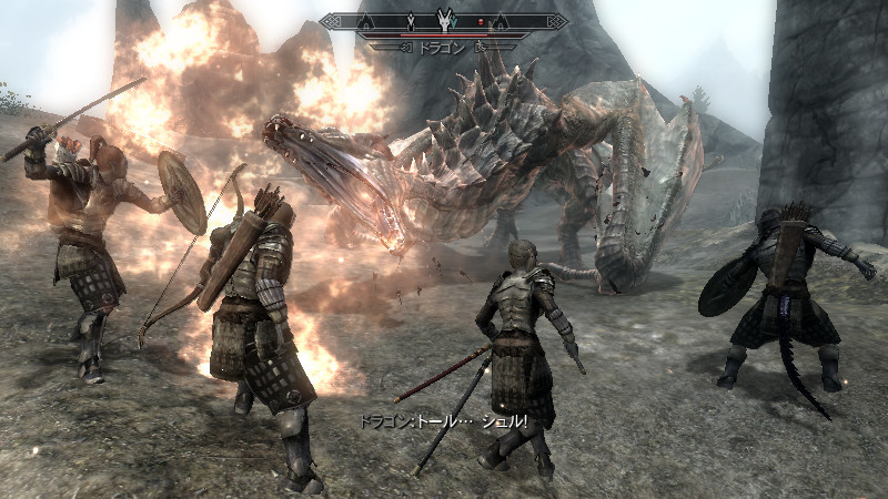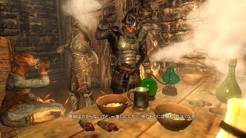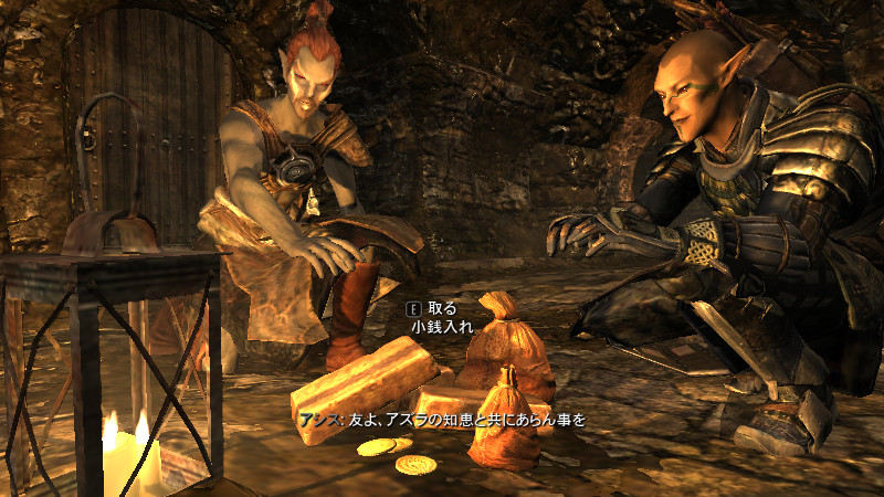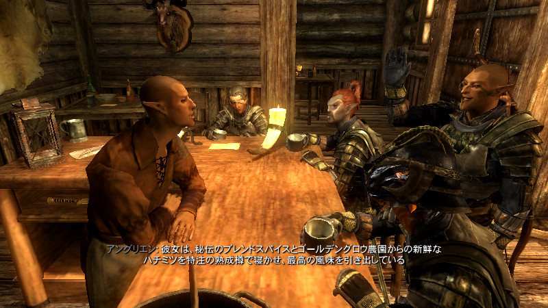 2015/08/23 Category : プレイ日記 自作Modのテストプレイ⑦ アシス達がブレイズに入団したことをきっかけに、自作AIの優先度に従って勝手に行動していた彼らを適切に誘導できるよう、「同胞団」と「ブレイズ」という2つの派閥を『掛け持ち』するための方法を考えることになりました。解決策に行き詰っていたところ、「Questを分割する」という素晴らしいアドバイスをいただけたおかげで、フォロワーAIの複雑な構成が可能になりました! 大きな成果として、Quest同士の相互関係を利用した製作に、理解が深められたように思います。 登場回数の乏しいNPCに「ブレイズ」などの肩書を与えることで、彼らにイキイキとした人生を歩んでもらうことができます。その一方で、プレイヤーの“相棒”として、複数の役割を担当させ、どんな時も行動を共にしたい、特別な存在のフォロワーもいると思います。そのような場合に、『Quest連動型AI』を作成することによって、フォロワーのAIに条件の変化に応じた判断を行わせ、様々な立場を交替で活動してもらうのも、これまでとは違った新鮮さがあると感じられました。 “あらゆる組織に加入することができる、”プレイヤーほどの特権を持つことはできませんが、スカイリムの“複数のギルドをまたにかけて行動するフォロワー”が現れたら、強力な助っ人になりそうです。それとは逆に、立場を伏せて敵組織に潜入していて、ある日突然裏切りを働く“スパイNPC”なども居たら、緊張感のあるロールプレイを楽しめそうな気もします。 テストプレイの確認ポイントのうち、『ブレイズ』の項目を無事にクリアすることができました。次は、もう一つの待望(?)のテーマである―――フォロワーの『結婚』について、調査を開始します。 戦いを積み重ねる内に、貫禄と渋味が出てきたアシスの「※“花嫁”になるのは、果たして誰なのか?」。様々な派閥に属しているフォロワーの「結婚後の生活がどう変わるのか?」。そして、「自作Modとの関係性」について、お楽しみプレイと共に入念にチェックをしていきます。 ※花嫁役として、プレイヤーが一時的に“あるNPC”の役を演じながらアシス(フォロワー)と結婚する予定です! 『結婚』は、離婚や再婚ができないスカイリムでは…“人生たった一度限りの重大イベント”! またもや、テストプレイの方が疎かになってしまいますが、この機会を盛大に楽しんでみたいと思います。 【マーラが微笑みますように!】 vol.1~恋の予感~ 冒険Packageの旅日程が終了し、数日後にスカイ・ヘヴン聖堂に帰ってきたアシスは早速、デルフィンからの“愛の鞭”という名の“お仕置き”により、強烈なトラウマを植え付けられることになった。 (……ヒュォォォオ~……) ハドリア&スレン「隊長……。(明日は我が身だ…)」 (メキメキメキッ×2……ジタバタ×2……) アシス「グェーッ!!!…がはぁっ…が…か…(落ぢるッ…斬られ゛るッ……息がでぎないッ…お助けを゛……)」 その光景を目の当たりにした、新人2名。彼らがブレイズの任務中に、勝手な理由で行動することは……金輪際ないと思われる―――。 反省と自戒の念を込めて、同胞団一行はデルフィンからの、「※ドラゴン狩り」へ行って来い、という指令を快く引き受けました。 道化エルフ「・・・。(ドラゴンを倒すことが義務化し、いつの間にか…彼らの中だけでどんどん話が進んでいるッ!それに…異様なまでの、“してやってる感”。…ドラゴンボーンは戦いにおいて、常に一対一でケリを着けなきゃいけナイ伝統でもあったのか??自分たちは決して現地へは赴かず、新人をこき使ってイルというのに。…元祖ブレイズ、いや…彼らはもしや、精神がブレないという意味の…“ブレ~ず”なのかもしれン!!)」 ※ブレイズの「ドラゴン狩り」のQuest、「FreeformSkyHavenTempleB」(Priority=46)が開始されると、非雇用状態のフォロワー達は、一斉に現地に向かって走り出しました。現在、同胞団の活動を「月・火・木・金」、ブレイズの活動を「水・土・日」に設定していますが、いずれのAIにも影響されることなく、プレイヤーがエズバーンから依頼を受け取った瞬間に、どちらの場所に居たとしても現地に集合してくれました。(自作Modによる悪影響が出なくて良かったです!) エズバーンに「ドラゴンスレイヤーの祝福」を授けてもらい、“ボーンストレウン山脈”へ向かいました。たった4人だけで、巨大なドラゴンに立ち向かって行く宿命を背負っているなんて…ブレイズって、本当に恐ろしい秘密組織です(ブラックすぎる)。それゆえ、ドラゴンボーンのレベルに着いて行ける精鋭や、ずば抜けた戦闘能力を持った選ばれし者のみが生き残り…入団を許可されたり、日常に厳しい制約と戒律が設けられていたりする側面があるのかもしれません…。 しかし、割とあっさりドラゴンを仕留めてしまう同胞団。アシスを始め…彼の「Class」から派生したステータスを持つ同胞団の新人2名は、『片手武器適性』と『重装適