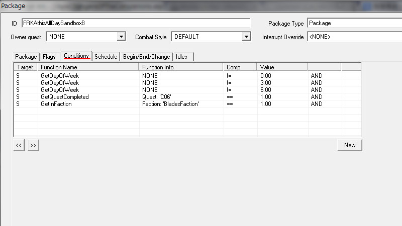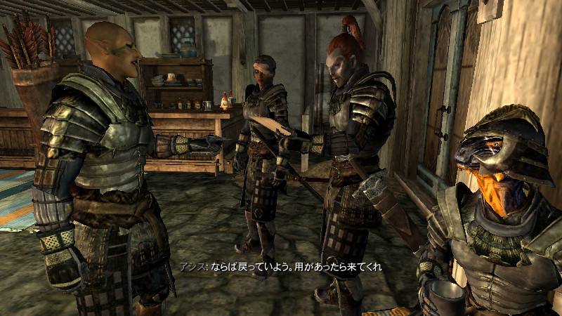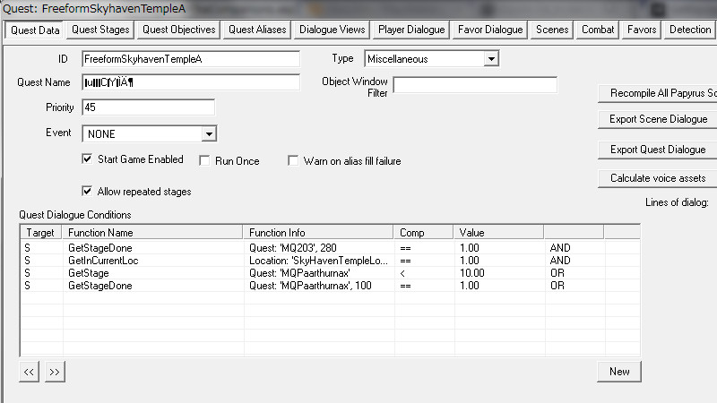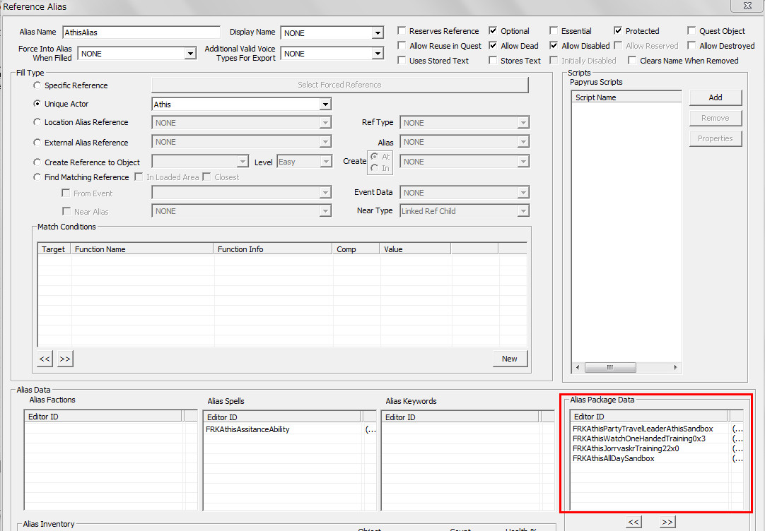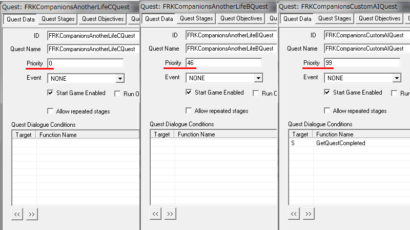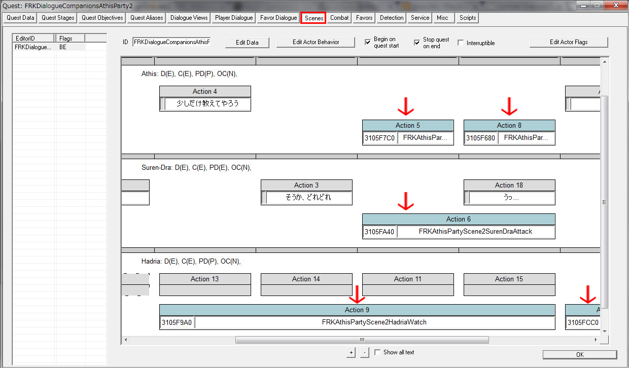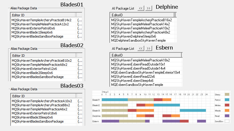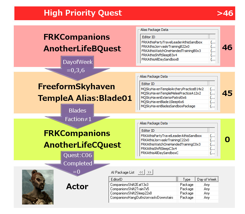 2015/08/12 Category : プレイ日記 自作Modのテストプレイ⑥ 自作Modを作り始めてから、あと少しで完成という所まで来ていたので、前回の『ブレイズ入団編』の最中に、自作Questによって「※Quest同士の優先度によるAIの上書き」が発生する事態に直面し、正直困惑してしまいました。おそらくブレイズQuestに限らず、他のQuestにも影響を及ぼしかねない、中々手強い問題であると考えられます。 ※ブレイズに入団させたNPCが、スカイ・ヘヴン聖堂で暮らさずに、自作したAIで勝手に行動してしまう問題。 なんとなく、前々から危ない予感はあったのですが…筆者自身、Quest製作の知識が圧倒的に不足しているので、「どうか何も起こらず上手く行きますように!」という思いで、テストプレイで実際にどうなるのかを試して、観察していました。そして、案の定…不具合が生じてしまいました。この状況になってみるまでは、どういう所が良くなかったのかが全く分かりませんでした。自分はフォロワー(広義にはNPC)に、「AIを設定する際の基本ルール」というものを理解していなかったことに気が付きました。 今回はその反省を踏まえて…頭の中の情報を整理する意味も込めつつ、「AIを設定する際の注意点」と「Quest同士の優先度の調整方法」について、苦戦した部分をまとめておきたいと思います。 【戦士と武士】 ~前編~ デルフィンに「アシス達を連れ戻しに行け!」との命令を受けた道化エルフは、急いでジョルバスクルへと戻るも…一足先に彼らは「冒険Package」によって、既に消息を絶っていた。そして数日間、“配達人”のごとくスカイリム全域に渡って、野を越え…山を越え…スタミナの続く限り、駆けずり回る羽目になったのであった。 ―――遂に街道でアシス達を発見した道化エルフ。彼らは付近の円墳から出現した個体と自然発生した個体の、“2匹のドラゴン”を相手に、攻防を繰り広げていた。(旅先でも偶然、※ブレイズの使命を全うしていた姿には…驚きました!!) ※フォロワーをブレイズに入団させると、「BladesFaction」の他に、「BladesRecruitsFaction」が付与されるようです。この派閥は、“DragonFaction”と「Enemy」の関係にあるため、ドラゴン出現時に、入団以前よりも素早く反応して戦闘態勢に移行できるようになっていました。CKで確認するまで全く気づきませんでしたが…ブレイズの一員になったことで、いくつかの“見えない変化”がフォロワーに与えられているようです。 道化エルフ「あれッ…?!(いたーーー!!!)」 道化エルフ「…ハァ……探したぞ、アシス…スカイリム中を“ランダムに放浪”しやがって!本当に…お前たち(NPC)の身勝手さには、恐怖を感じざるを得ないヨ…。」 アシス「こんな所まで後を追って来たのか、なんてしつこい奴だ。見ての通り、我々は“ブレイズの役割”をきちんと果たしているぞ!…それで、何か用か?」 (とりあえず、アシス達が聖堂に戻ってくるように『説得』しなければ……) 道化エルフ「ブレイズには、栄誉と栄光!充実した活動や強力な装備!!敵に見つからない広大な隠れ家!!!全てが揃ってイル。現在は小規模だが…発展次第でひょっとすると、スカイリム史上…“最強の組織”になり得るんジャないか?…古参者の方が敬われるし、いっそのこと同胞団から早いうちに“鞍替え”を……いや、今のは言葉の綾ダ! それらを放棄してまで、“同胞団になる”というのは、どういう意味を持つんだ?(実際にはイイとこ取りをシテるだけなんだけど、汗)」 アシス「個人的には、馬鹿げた質問に2度答えなくて済むって事だと思っている。我々の存在意義も知らずに、なぜジョルバスクルにわざわざやってきたんだ?」 (シャキキキン…) 道化エルフ「アハッ…?!!」 『説得』、失敗―――。 アシス「―――これはお遊びなんかじゃない。我々はスカイリムにおける真の精神性の象徴だ。栄誉は血に、死は心に宿る。」 ハドリア「まさかあなたには…」 スレンドラ「その覚悟が無いと…?」 道化エルフ「いやいやいや×3……私の“スキンヘッド”にかけて、こんな馬鹿げたことを言うつもりは、毛頭なかった!(連れ戻しに来ただけなのに…なんか、到着早々…完全に誤解されちゃってるんですケド。油汗)……普段よりカッコ良い台詞を吐きすぎてて、全く伝わって来ないんだヨ。つまり、それは―――?」 アシス「―――富と栄光のためだ、友よ。ただそれだけだ。」 道化エルフ「ズコ~ッ…!!!(なるほどネ、さすがは同胞団の初期メンバー。実に脳筋で単純明快だ…。常に心にアルのは、同胞団。だけど、ブレイズも『掛け持ち』シテ、双方から“甘い汁を吸う”って魂胆か。そして、富と栄光の先には…念願の“サークル”の座が待っている訳ダ、納得。……って、結局いつものパターンかいッ!!)」 「じゃ、じゃあ…アシスはともかく、同胞団の新人2名!! 普段から無口で、黙ってることが多いけど…お前らは何なんだヨ? 新参者に、そこまで同胞団への思い入れがアルのか?」 スレンドラ「ブ